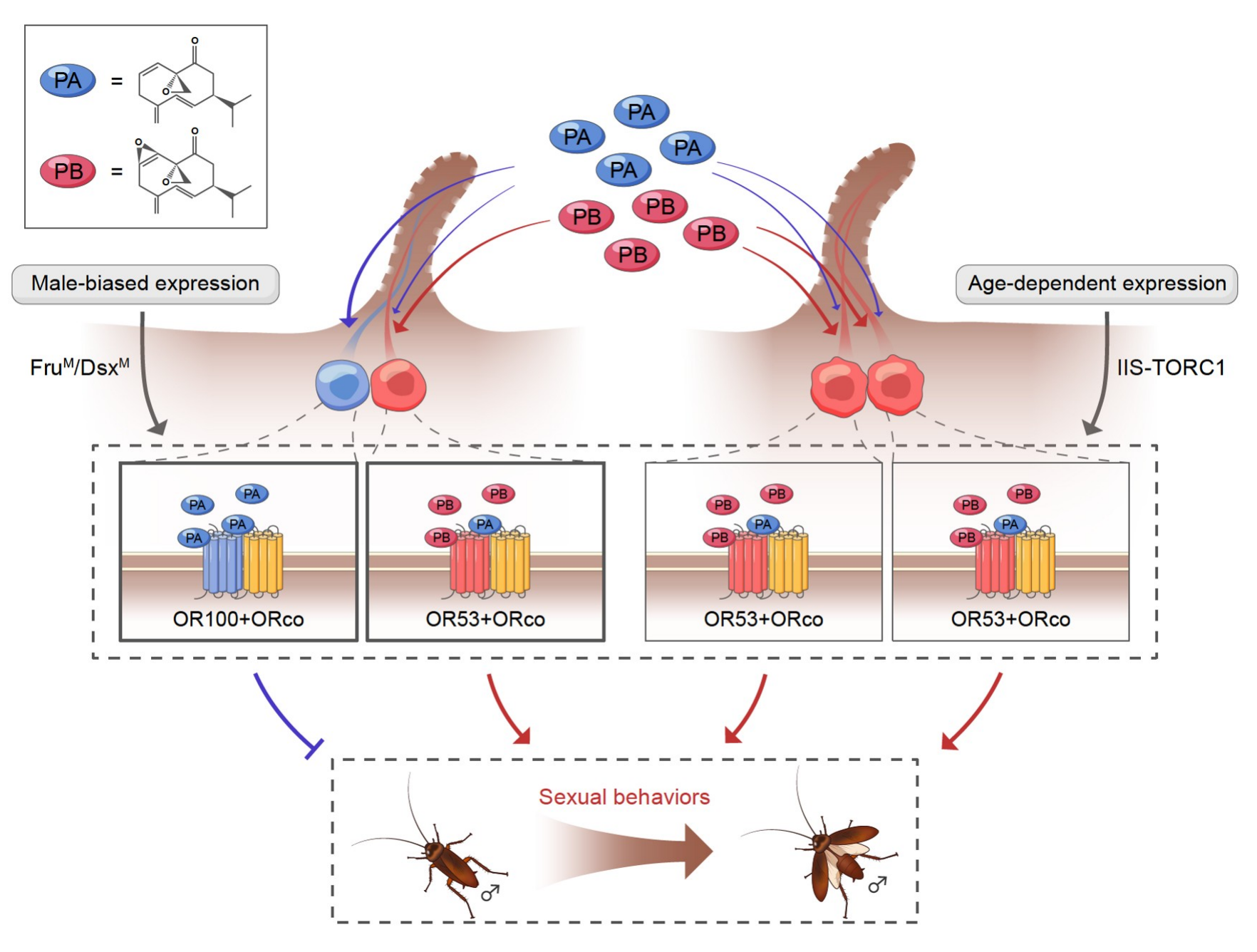 研究結(jié)果表明,PB作為主要的性信息素成分,通過激活OR53受體來誘導(dǎo)雄蟲的求偶交配行為。而PA雖然單獨(dú)存在時不吸引雄蟲,但其存在能夠通過兩種可能的途徑減弱PB的吸引作用:一是PA與PB競爭激活相同的受體OR53,二是PA通過激活其特定的受體OR100來抑制性行為。該研究確定了兩種性信息素嗅覺受體以及可能調(diào)控雄蟲特異性和年齡依賴性求偶交配行為的分子機(jī)制,有助于發(fā)展綠色防蟑技術(shù)及害蟲綜合管理策略。