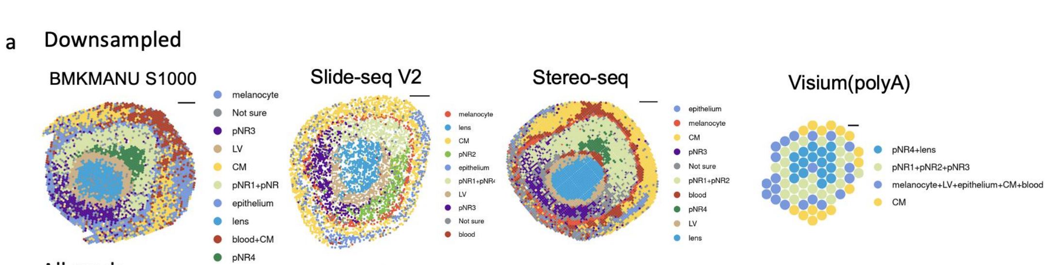 使用11種sST技術(shù),對三種組織進(jìn)行實(shí)驗(yàn),測序及分析,并對可以實(shí)現(xiàn)更高分辨率的BMKMANU S1000Stereo-seqSlide-seqV2?在細(xì)胞級(10μm)分辨率下進(jìn)一步進(jìn)行了分析。