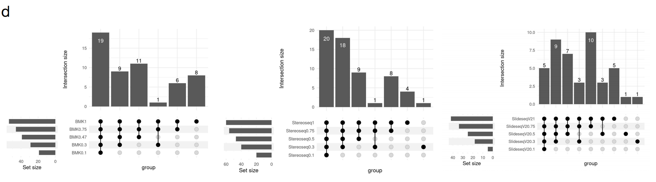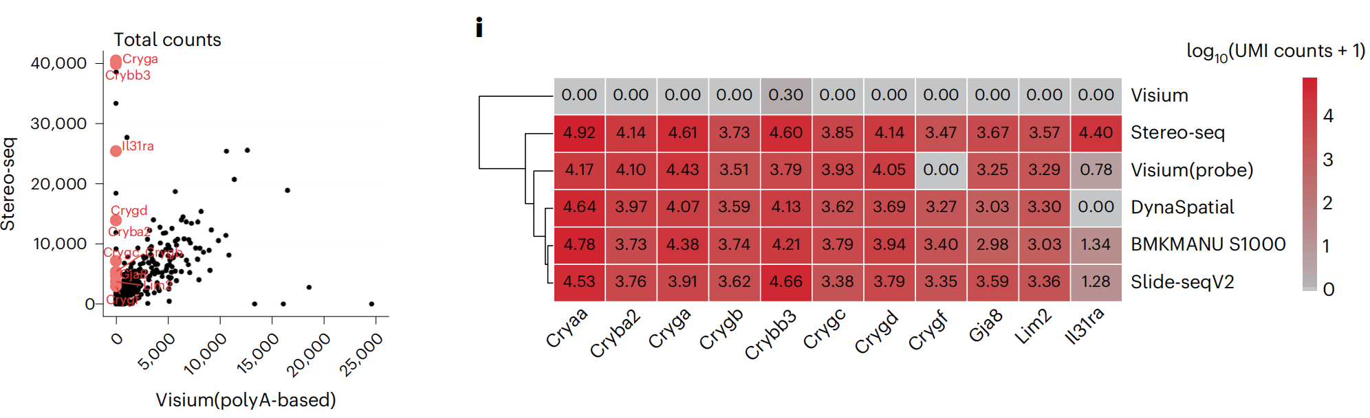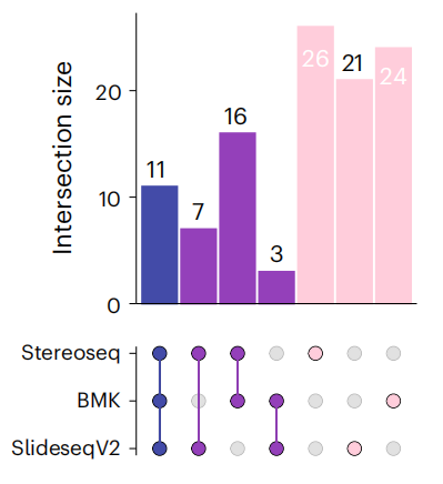 文中對visium(polyA-based)未能捕獲到的基因,在其它技術(shù)平臺中的表現(xiàn)也做了統(tǒng)計(jì),其中BMKMANU S1000、Stereo-seqSlide-seqV2都展現(xiàn)出了統(tǒng)一且全面的基因捕獲性能。