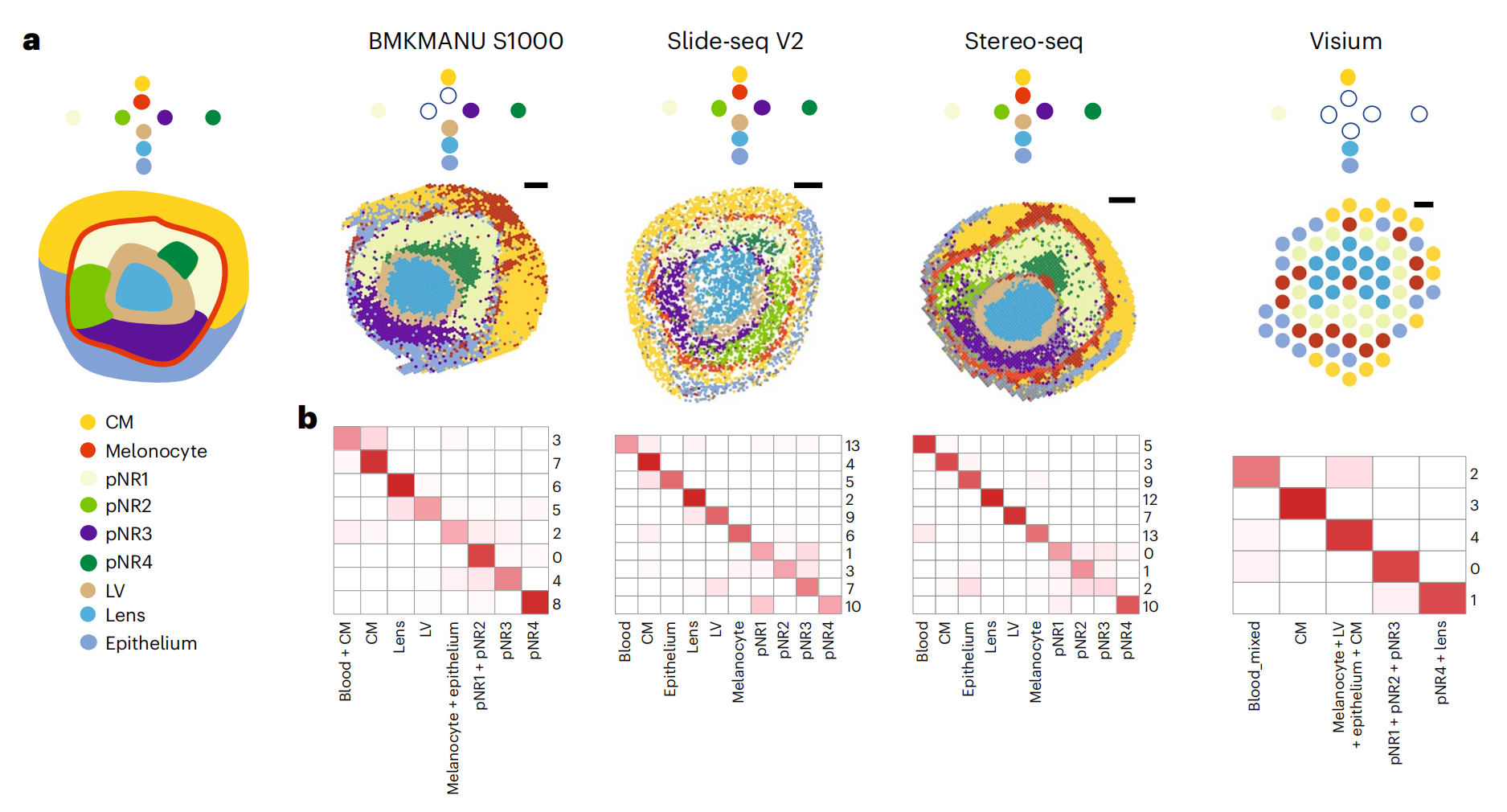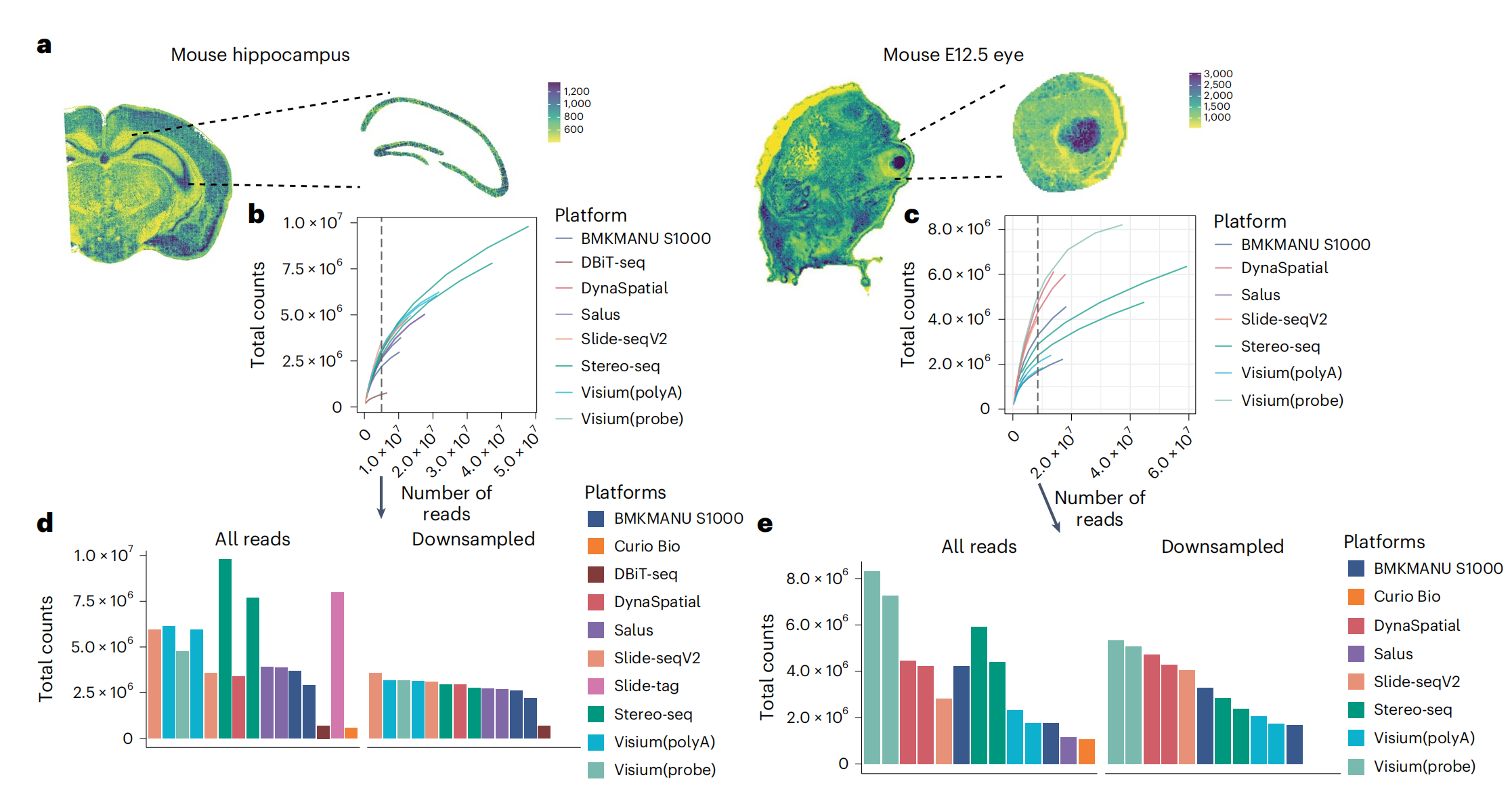 通過小鼠嗅球(Pixel-seq,Stereo-seq,Slide-seqV2),小鼠腦海馬(BMKMANU S1000,Slide-seqV2,Salus,Stereo-seq),小鼠胚胎眼球(BMKMANU S1000,Stero-seq,Slide-seqV2)經(jīng)典marker(Slc17a7、Ptgds及Pmel)的回溯來評估分子的橫向逸散問題,發(fā)現(xiàn)BMKMANU?S1000在腦海馬的表現(xiàn)優(yōu)秀,在小鼠胚胎眼球中表現(xiàn)不足,不同的技術(shù)表現(xiàn)出的差異,文中也給出了推論:可能跟樣本切片操作及組織透化等實(shí)驗(yàn)存在關(guān)聯(lián),提示后續(xù)的研究者在樣本準(zhǔn)備及透化實(shí)驗(yàn)應(yīng)該更加的謹(jǐn)慎。