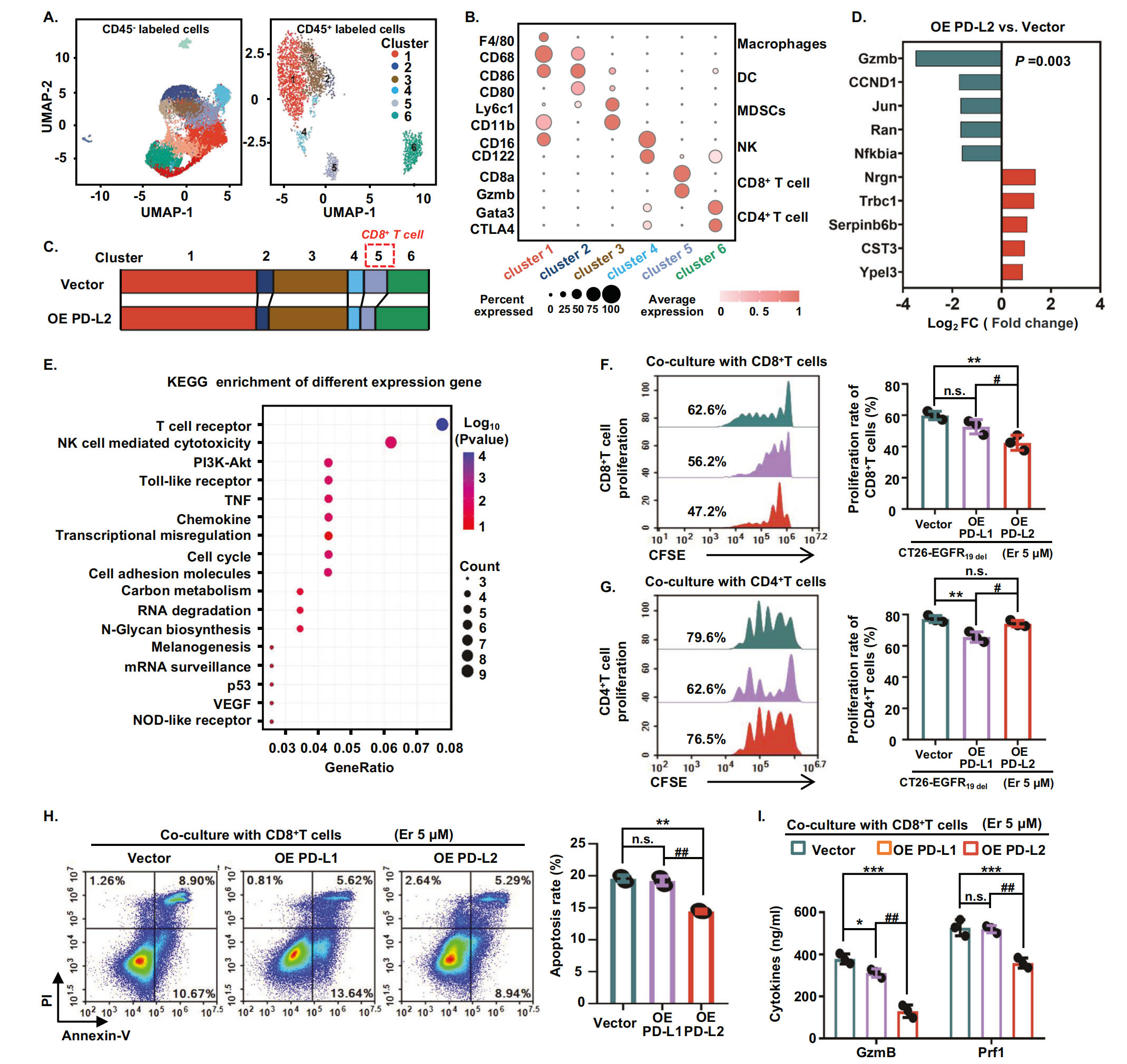 接下來,作者進一步探討了 PD-L2 表達升高影響免疫反應以降低腫瘤對 EGFR-TKIs 敏感性的機制。作者獲得了來自空載體或 PD-L2 過表達的同基因小鼠中 CT26-EGFR19del?細胞的腫瘤組織的單細胞轉錄組譜。作者對來自空載體樣本和 PD-L2 過表達樣本的整合單細胞數據集進行了聚類分析,并確定了六個主要的不同細胞群(圖6A、B)。作者發(fā)現(xiàn) PD-L2 過表達組中癌細胞的數量顯著增加,T 細胞的比例顯著降低(圖6C)。為了探索 EGFR-TKIs 耐藥的機制,作者分析了癌細胞的轉錄組特征。與空載體組相比,對 PD-L2 過表達組的差異表達基因進行 KEGG 富集分析。作者觀察到細胞凋亡通路顯著富集(圖 6D)。GSEA 分析顯示,PD-L2 過表達組癌細胞中與細胞凋亡途徑相關的基因顯著下調(圖6E)。這些結果表明,EGFR 突變腫瘤細胞中 PD-L2 表達的增加可導致細胞凋亡減少。作者的體內實驗數據進一步驗證了這些結論。TUNEL 染色顯示,與對照組相比,TKI 處理后 CT26-EGFR19del?PD-L2 過表達組腫瘤細胞凋亡受到顯著抑制(圖6F)?;谶@些結果,作者假設 EGFR 突變的腫瘤細胞中 PD-L2 表達增加會抑制癌細胞的凋亡,從而導致癌細胞的持續(xù)生長,耐藥性增加。