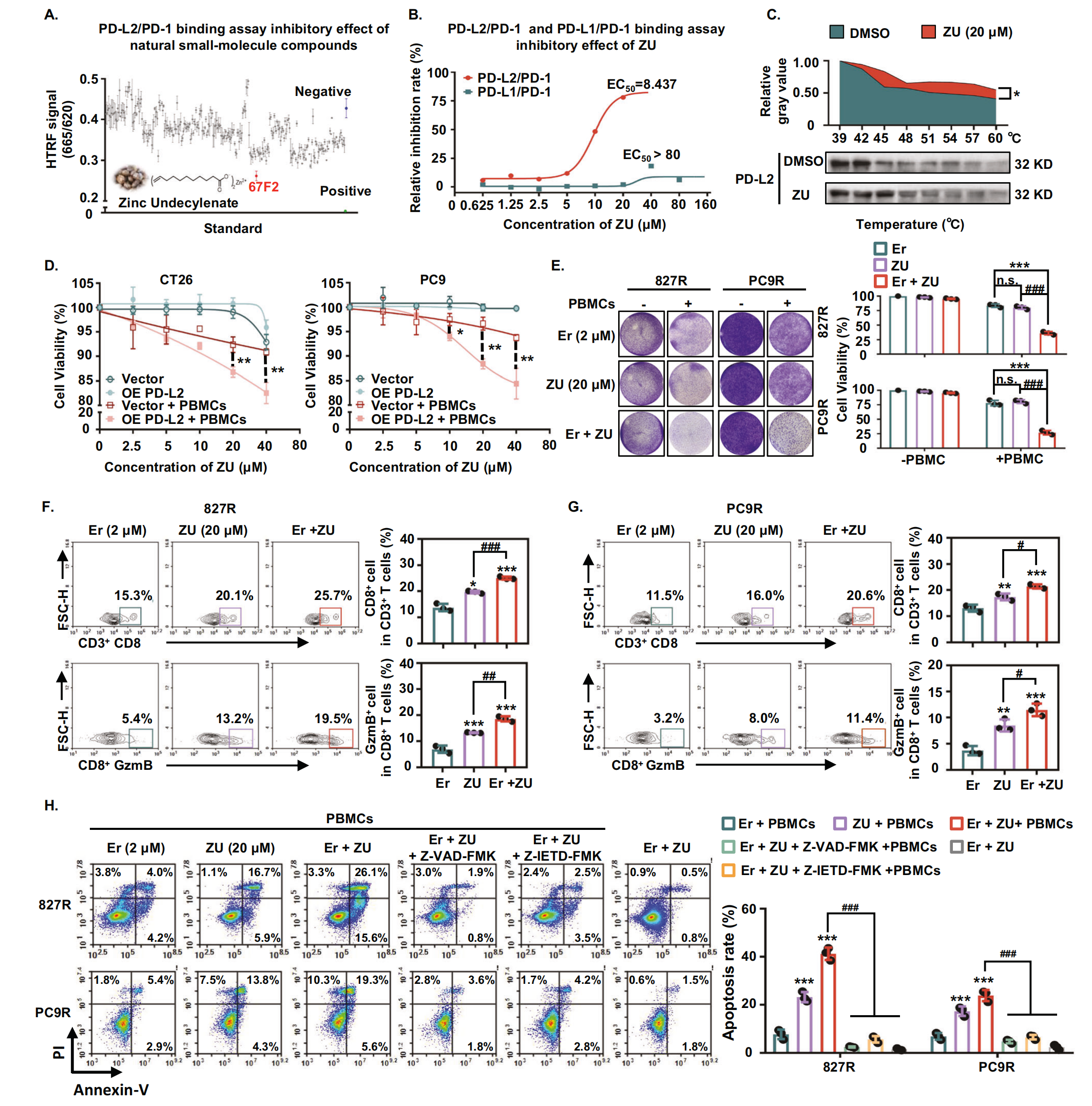由于目前市場上沒有靶向 PD-L2 的藥物,作者使用 HTRF 技術篩選了 1300 多種天然小分子化合物的庫,以鑒定 PD-L2 的特異性抑制劑。作者發(fā)現(xiàn)了一種小分子化合物十一烯酸鋅 (ZU),它選擇性地抑制 PD-L2/PD-1 結合,EC50?8.4 μM,而 PD-L1/PD-1 為 >80 μM(圖8A, B)。ZU 是由蓖麻油通過一系列化學反應和凈化過程生產的。CETSA 實驗表明,與 PD-L1/PD-1 相比,ZU 有效抑制了 PD-L2 與 PD-1 的結合(圖8C)。這些結果表明 ZU 具有阻斷 PD-L2/PD-1 相互作用的特異性能力。此外,作者利用空載體或 PD-L2 過表達的小鼠 CT26 細胞來驗證 ZU 的體外抗腫瘤作用。在 40 μM 濃度下,ZU 不會顯著降低 CT26 空載體和 PD-L2 過表達細胞的活力(圖8D),這表明 ZU 沒有直接的細胞毒性作用。然而,當腫瘤細胞與活化的 T 細胞共培養(yǎng)時,與 CT26 空載體細胞相比,ZU (40 μM) 顯著抑制了 CT26 PD-L2 過表達細胞的活力(圖8D)。這表明 ZU 通過靶向 PD-L2/PD-1 的免疫調節(jié)發(fā)揮抗腫瘤作用。使用具有空載體和 PD-L2 過表達的 PC9 細胞獲得了類似的結果(圖8D)。此外,作者研究了 ZU 和 EGFR-TKI 對親本和 TKI 耐藥 NSCLC 細胞的聯(lián)合抑制作用。對于耐藥細胞,結果表明,厄洛替尼聯(lián)合 ZU 對 827 R 或 PC9R 細胞的生長抑制具有協(xié)同作用,與單獨使用厄洛替尼相比,耐藥細胞的存活率顯著降低(圖8E)。重要的是,在沒有活化的 T 細胞的情況下,厄洛替尼聯(lián)合 ZU 的細胞殺傷效果沒有顯著差異(圖8E)。上述結果進一步表明,靶向 PD-L2 的 ZU 與 EGFR-TKI 的組合對耐藥腫瘤表現(xiàn)出協(xié)同抑制作用。