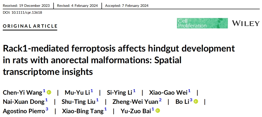 2024年7月,中國醫(yī)科大學盛京醫(yī)院在國際學術(shù)期刊cell proliferation發(fā)表一項重要研究成果,題為:Rack1‐mediated ferroptosis affects hindgut development in rats with anorectal malformations: Spatial transcriptome insights。使用空間轉(zhuǎn)錄組測序、免疫熒光、CCK-8、WB、ROS檢測等來剖析直腸肛門畸形的發(fā)育機制。