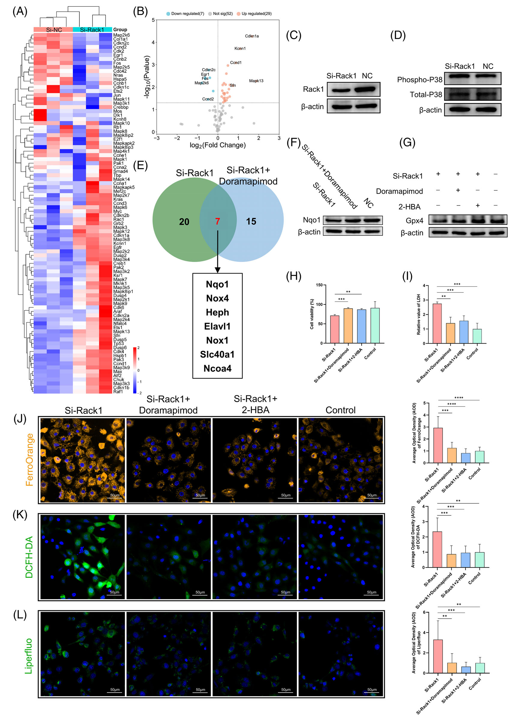 在 IEC-6 細胞敲低 Rack1 的同時,使用 doramapimod 和 2-HBA 進行拯救實驗。結(jié)果顯示,與單獨的 Rack1 敲低相比,添加 doramapimod 和 2-HBA 導致細胞活力增加和相對 LDH 含量降低 (p < 0.05;圖 6H,I)。此外,在添加 doramapimod 和 2-HBA 后,細胞內(nèi)亞鐵離子濃度降低,同時 ROS 和脂質(zhì)過氧化水平降低(p < 0.05;圖 6J-L)。這些發(fā)現(xiàn)表明,Rack1 通過P38信號通路和 Nqo1 調(diào)節(jié)細胞內(nèi)鐵含量和脂質(zhì)過氧化,從而介導腸上皮細胞的鐵死亡。