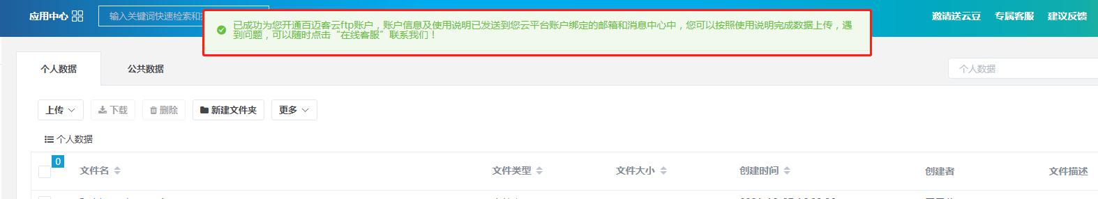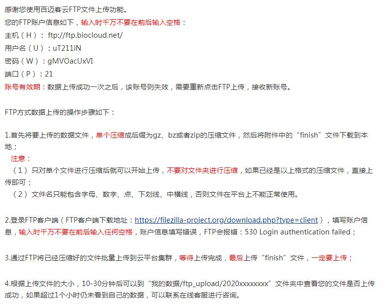 FTP 上傳:數(shù)據(jù)量大于 200M 時(shí)使用 FTP 上傳數(shù)據(jù)。選擇“FTP 上傳”后彈出提示對(duì)話框,點(diǎn)擊“確定”后系統(tǒng)會(huì)自動(dòng)創(chuàng)建一次性的 FTP 賬戶,用于本次數(shù)據(jù)上傳。賬戶信息會(huì)發(fā)送至注冊(cè)郵箱及平臺(tái)的“個(gè)人中心——消息中心”中。依照提示操作即可。