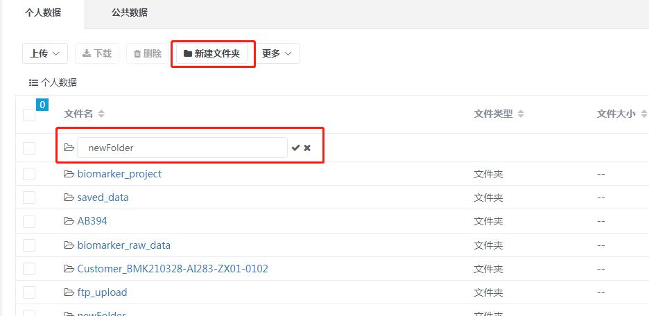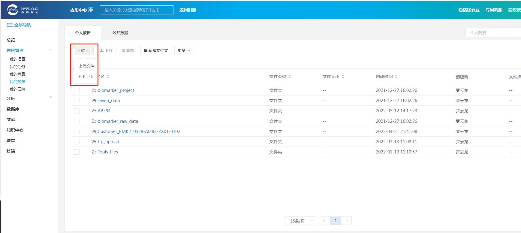 2、在我的數(shù)據(jù)中,建議新建文件夾后,進(jìn)入新文件夾,點(diǎn)擊“上傳”,選擇上傳文件或 FTP 上傳。