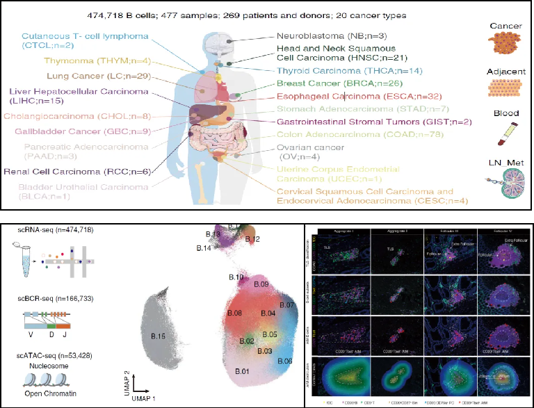 2024年,復(fù)旦大學(xué)附屬中山醫(yī)院樊嘉院士和高強(qiáng)教授、中國(guó)科學(xué)院上海免疫與感染研究所張曉明研究員、浙江大學(xué)基礎(chǔ)醫(yī)學(xué)院郭國(guó)驥教授合作在Science上發(fā)表了題為A blueprint for tumor-infiltrating B cells across human cancers的研究論文,結(jié)合單細(xì)胞轉(zhuǎn)錄組、 B細(xì)胞受體免疫組庫(kù)和表觀(guān)基因組的多組學(xué)數(shù)據(jù),系統(tǒng)性地刻畫(huà)了腫瘤浸潤(rùn)性B細(xì)胞的異質(zhì)性、動(dòng)態(tài)分化和表觀(guān)調(diào)控機(jī)制。創(chuàng)新地揭示了腫瘤微環(huán)境中廣泛存在的EF應(yīng)答的癌種偏好性、空間定位特征、臨床意義及潛在的誘導(dǎo)調(diào)控機(jī)制。
