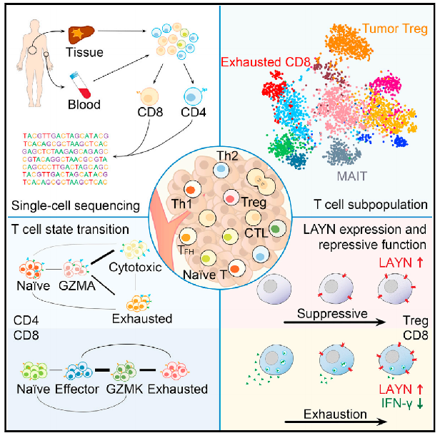 2017年,張澤民院士研究組,通過(guò)大規(guī)模單細(xì)胞測(cè)序技術(shù)對(duì)肝癌相關(guān)T淋巴細(xì)胞進(jìn)行分析,首次在單細(xì)胞水平上描繪肝癌微環(huán)境中免疫細(xì)胞圖譜,發(fā)現(xiàn)了肝癌免疫療法的潛在靶點(diǎn),也為我們從多角度系統(tǒng)性理解肝癌T淋巴細(xì)胞特征奠定了基礎(chǔ)。(2017,Cell,Landscape of Infiltrating T Cells in Liver Cancer Revealed by Single-Cell Sequencing)