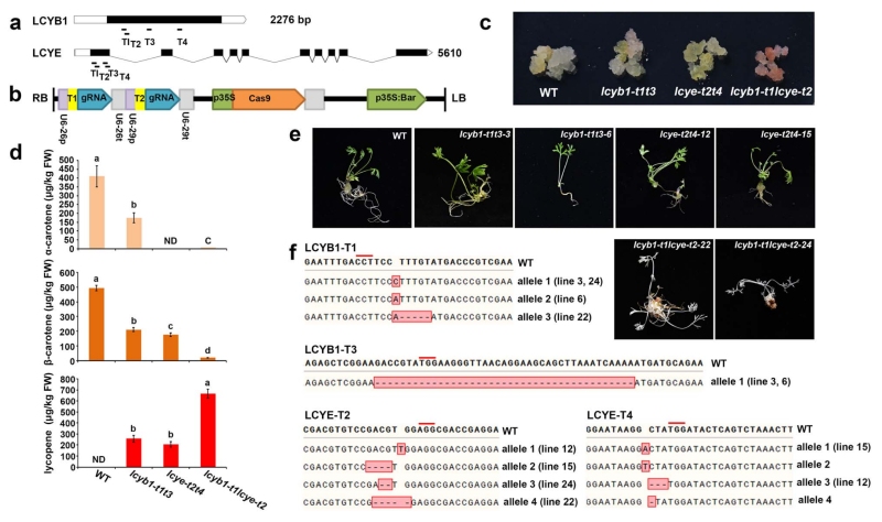 圖4-橙色胡蘿卜‘Kurodagosun’中DcLCYB1和DcLCYE的敲除