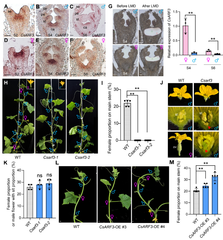 該研究首先發(fā)現(xiàn),外源施加生長素(IAA)可提高黃瓜雌雄花比例。在16個(gè)黃瓜ARF家族成員中,CsARF3在雌性系WI1983G的雌花芽中表達(dá)顯著高于其近等基因系WI1983GM(ACS1G突變,以雄花為主)的雄花芽,且在性別決定期(第6期之前)的表達(dá)更高(圖1A-G)。利用CRISPR/Cas9技術(shù)構(gòu)建的Csarf3移碼突變體(Csarf3-1和Csarf3-2)僅產(chǎn)生雄花,而野生型(WT)為雌雄同株(圖1H,?I)。突變體部分雄花在心皮殘留部位出現(xiàn)花柱樣組織,其比例與野生型的雌花比例相似,暗示Csarf3突變導(dǎo)致雌花向雄花轉(zhuǎn)化(圖1J,?K)。相反,CsARF3過表達(dá)株系(CsARF3-OE)的雌花比例和復(fù)合雌性(每節(jié)多雌花)比例均顯著增加(圖1L,?M)。外源IAA處理無法恢復(fù)Csarf3突變體的雌花產(chǎn)生,表明CsARF3介導(dǎo)的生長素信號(hào)是黃瓜雌花形成不可或缺的環(huán)節(jié)。