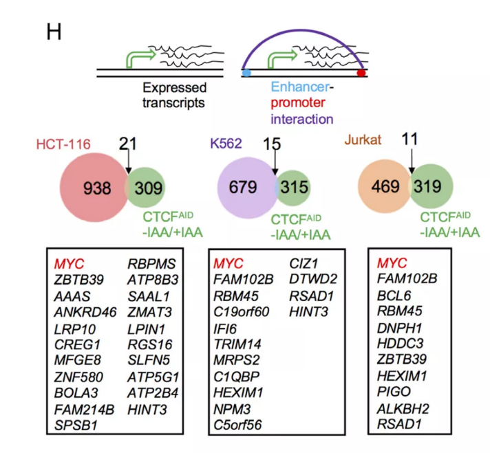 CTCF基因啟動子的染色質(zhì)可及性在CTCF耗竭時也有所增加(圖3D),這一點(diǎn)通過定量PCR (Q-PCR)進(jìn)一步得到驗(yàn)證(圖3E)。這些數(shù)據(jù)表明CTCF可以抑制自身以保持最*表達(dá)水平。對于CTCF耗竭后被下調(diào)的基因,如MYC,并沒有在啟動子區(qū)域檢測到有統(tǒng)計學(xué)意義的染色質(zhì)可及性變化。因此,當(dāng)啟動子區(qū)域保持開放時,遠(yuǎn)端增強(qiáng)子區(qū)域的染色質(zhì)景觀變得更難以接近,再加上CTCF耗竭,可能在控制能調(diào)控MYC轉(zhuǎn)錄的遠(yuǎn)端增強(qiáng)子-啟動子loop環(huán)的形成中發(fā)揮作用。