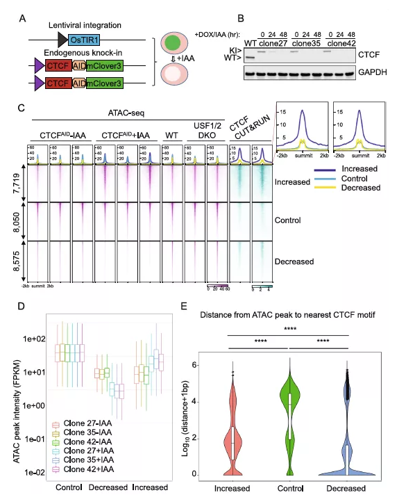 前期研究已經(jīng)通過將雙等位基因miniAID-mClover3標(biāo)簽導(dǎo)入人的內(nèi)源性CTCF位點(diǎn),并產(chǎn)生了三個CTCFAID細(xì)胞的克隆。在強(qiáng)力霉素和生長素(IAA)處理下,強(qiáng)制表達(dá)與Skp1/Culin/F-box (SCF)泛素連接酶組分連接的OsTIR1,快速降解CTCF融合蛋白(圖1A)。當(dāng)強(qiáng)力霉素和IAA完全從培養(yǎng)基中洗脫后,這種降解是可逆的。通過對三個單細(xì)胞來源的克隆進(jìn)行IAA處理24小時的免疫印跡實(shí)驗(yàn),證實(shí)了CTCF能夠有效降解(圖1B),類似于之前在48h處理?xiàng)l件下的研究結(jié)果。