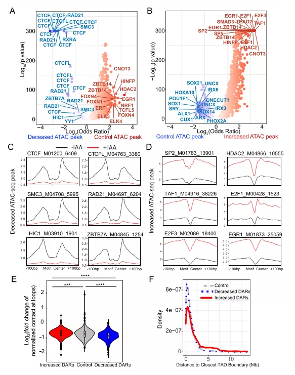 接下來分析這些DARs與它們最近的CTCF motif之間的物理距離。結(jié)果表明,可及性減弱的DARs更接近于最近的CTCF motifs。相比之下,可及性增強(qiáng)的DARs與CTCF motif的距離顯著高于可及性減弱的DARs,但顯著低于對照組(圖1E)。