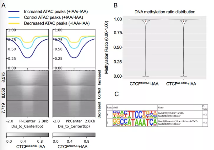 前面綜合分析了在CTCF耗竭后,隨著染色質(zhì)可及性的改變,轉(zhuǎn)錄因子的占用情況。接下來通過查看motif數(shù)據(jù)庫TRANSFAC中所有帶注釋的TF motif,在三類區(qū)域中計算他們的富集頻率:減弱的DARs、增強(qiáng)的DARs和對照區(qū)域。發(fā)現(xiàn)在減弱的DARs中最富集的TFs是CTCF和黏連蛋白(SMC3和RAD21)(圖2A)。Tn5插入位點(diǎn)的foot-printing分析證實(shí),它們的motifs在motif中心受到保護(hù)(圖2C)。這些結(jié)果表明,減弱的DARs反映了CTCF耗竭產(chǎn)生的影響。