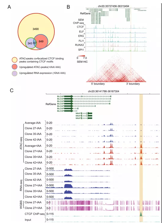 本文通過綜合分析建立了一個框架來識別假定的CTCF介導(dǎo)的絕緣子元件。將ATAC-seq結(jié)果中的3490個峰和有CTCF結(jié)合的峰取交集,共有716個增強(qiáng)的ATAC-seq峰。接下來,將它們與RNA-seq結(jié)果中上調(diào)的基因進(jìn)行比對,判斷TSSs是否位于距離DARs區(qū)域2-50 kb的范圍。綜上所述,有67個基因符合這些標(biāo)準(zhǔn)(圖(Fig 4A)。這67個基因中有20個基因的附近有染色質(zhì)loop環(huán)。例如,在BLCAP基因上游約7 kb處觀察到一個假定的抑制性CTCF結(jié)合峰,該峰位于Hi-C數(shù)據(jù)所示的染色質(zhì)絕緣loop環(huán)中(圖4B )。在未經(jīng)過IAA處理的對照CTCFAID細(xì)胞中,CTCF與該motif結(jié)合導(dǎo)致染色質(zhì)可及性受到抑制,這在ATAC-seq數(shù)據(jù)中信號的缺失很明顯。然而,在急性CTCF耗竭時,ATAC-seq峰值信號和BLCAP mRNA表達(dá)明顯增加(圖4C)。