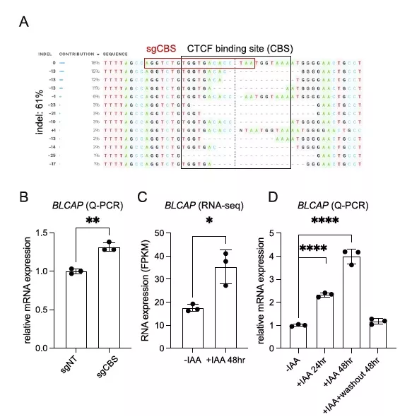為了進(jìn)一步驗(yàn)證預(yù)測的假定絕緣子的作用,將慢病毒表達(dá)的引導(dǎo)RNA感染表達(dá)Cas9的SEM細(xì)胞中,然后進(jìn)行抗生素選擇。Sanger基因組測序(Inference of CRISPR edit, ICE)在目標(biāo)人群中檢測到約61%的總indel頻率(圖5A),與非靶向?qū)驅(qū)φ战M(sgNT)相比,導(dǎo)致BLCAP mRNA表達(dá)顯著增加(圖5B)。用IAA處理CTCFAID細(xì)胞24和48小時,然后洗脫IAA進(jìn)行CTCF修復(fù)。通過RNA-seq分析和Q-PCR驗(yàn)證,驗(yàn)證急性CTCF蛋白耗竭時BLCAP mRNA的表達(dá)(圖5C)。不出所料,生長素處理24或48 h后CTCF蛋白急性耗竭,BLCAP表達(dá)水平顯著升高。更重要的是,洗脫生長素后,其表達(dá)水平恢復(fù)到親本細(xì)胞的水平(圖5D)。綜上所述,這些數(shù)據(jù)有力地支持了CTCF在BLCAP調(diào)控區(qū)域的占用充當(dāng)了控制BLCAP表達(dá)的功能絕緣體。