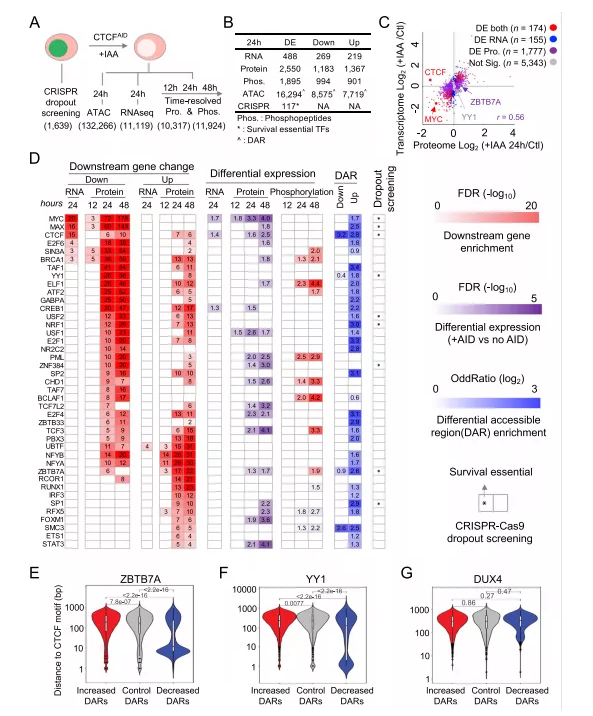 本文開發(fā)了一種多組學(xué)聯(lián)合的方法來定義CTCF共調(diào)控轉(zhuǎn)錄因子,總共鑒定了40個CTCF共同調(diào)控因子,這些TF在急性CTCF耗竭時在mRNA和/或蛋白質(zhì)水平上顯著影響其下游靶基因的表達(dá)(圖6D)。正如預(yù)期的那樣,這40個CTCF共調(diào)控因子中的大多數(shù)也在CTCF介導(dǎo)的DARs中有共同定位,證實(shí)了它們與CTCF有著潛在的直接共同調(diào)控作用。