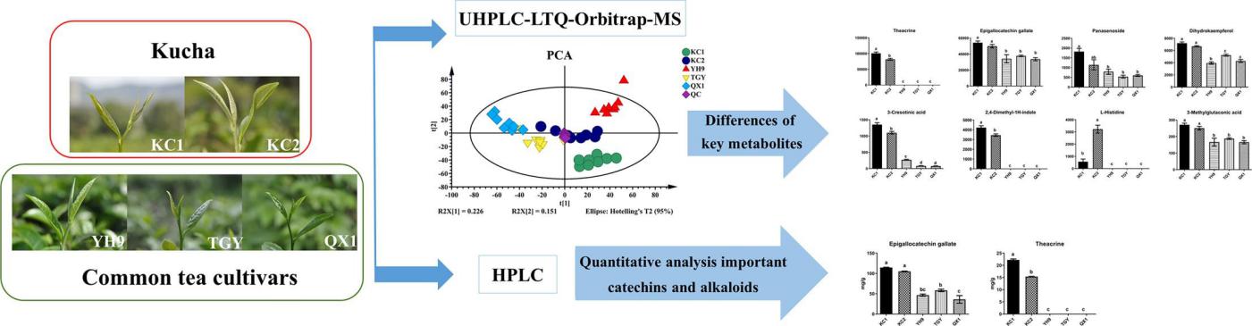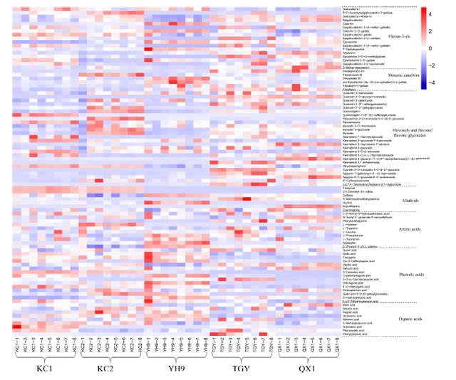 研究結(jié)果:采用非靶向代謝組學(xué)方法,研究了苦茶的代謝物。結(jié)果表明,2個苦茶品種與3個對照普通茶品種之間共鑒定出90種差異代謝物。其中,茶苦堿等8種代謝物在KC1和KC2中的含量均顯著高于對照品種。這些化合物中的大多數(shù)都是導(dǎo)致苦茶苦味的重要因素?;诟咝б合嗌V的定量分析結(jié)果與LC-MS分析結(jié)果相似,表明苦茶中茶苦堿和EGCG含量高于對照品種。此外,研究數(shù)據(jù)還表明,苦茶的強(qiáng)烈苦味可能是兒茶素、生物堿、黃酮醇和黃酮醇/黃酮苷、氨基酸和酚酸的綜合作用的結(jié)果。為進(jìn)一步研究苦茶的苦味和營養(yǎng)特性提供了理論依據(jù)。