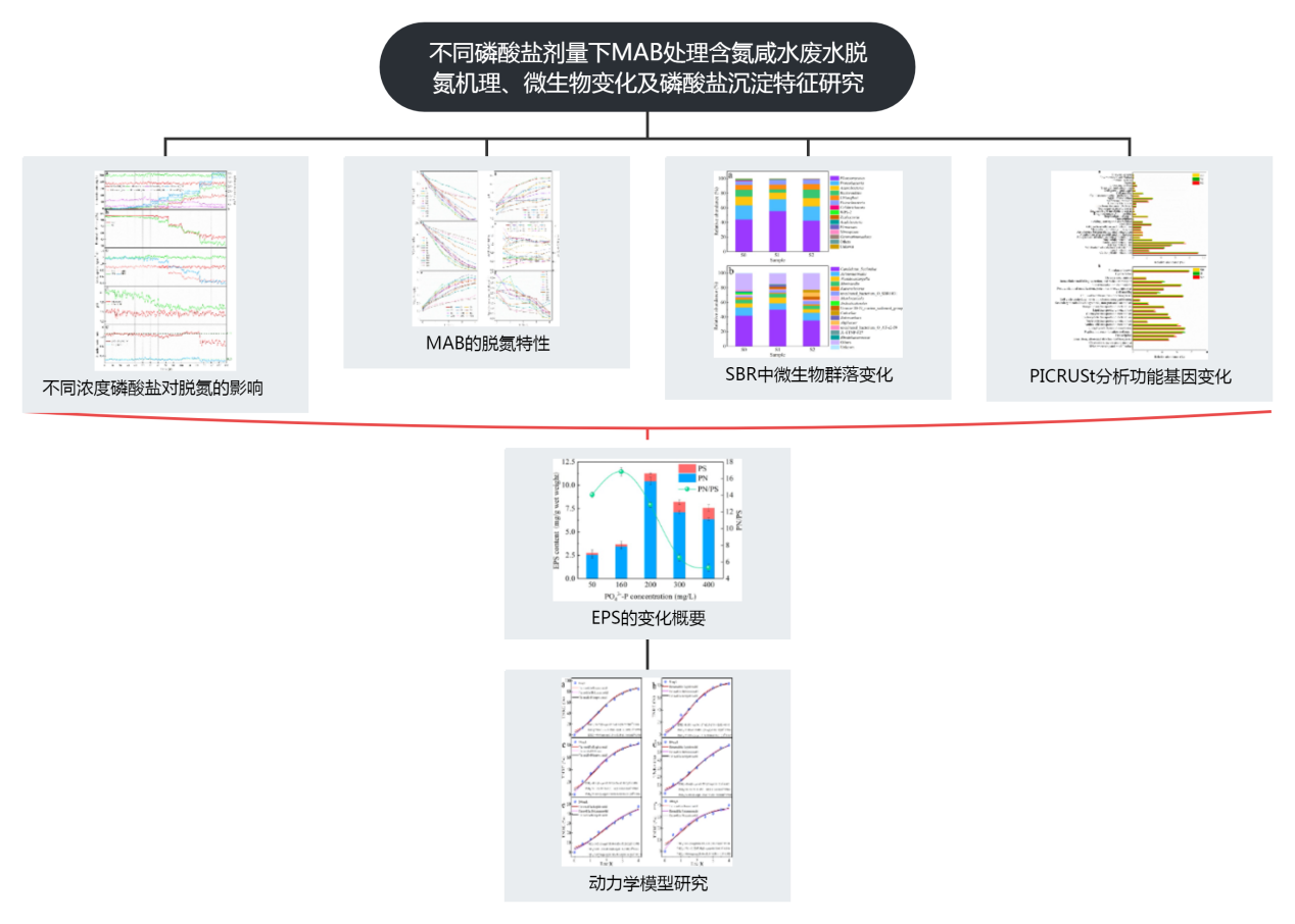 本研究首次探索了含氮含鹽廢水中不同磷酸鹽劑量下MAB的脫氮工藝。MAB的活性在含低濃度磷酸鹽時(0-30 mg/L)增強(qiáng),高濃度時(160~400 mg/L),NH4+和NO2-的去除率下降,MAB相對豐度下降了15.4%。此外,沉積物的存在迫使微生物產(chǎn)生更多的EPS以保護(hù)自己免受損害。通過低濃度磷酸鹽促進(jìn)MAB的厭氧氨氧化過程或?qū)}廢水脫氮處理有重大意義,SBR中磷酸鈣鎂沉淀的形成,或許為磷元素的回收提供了思路。
