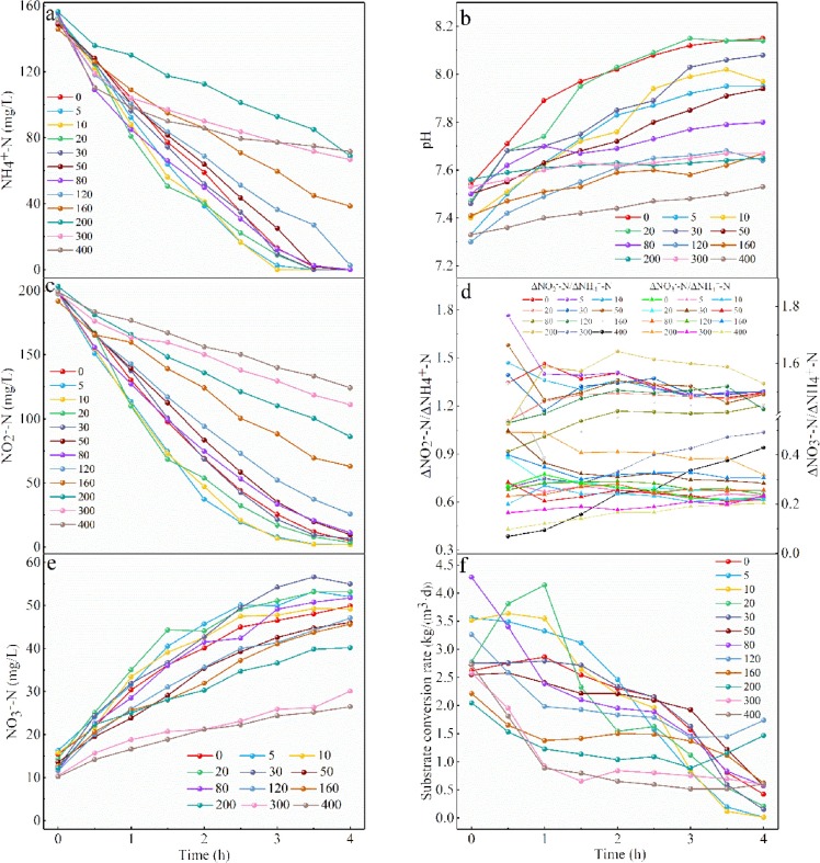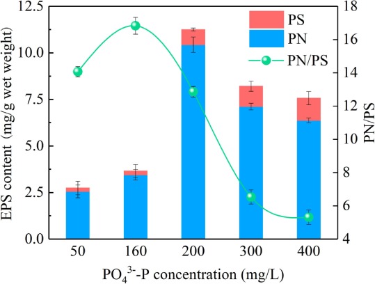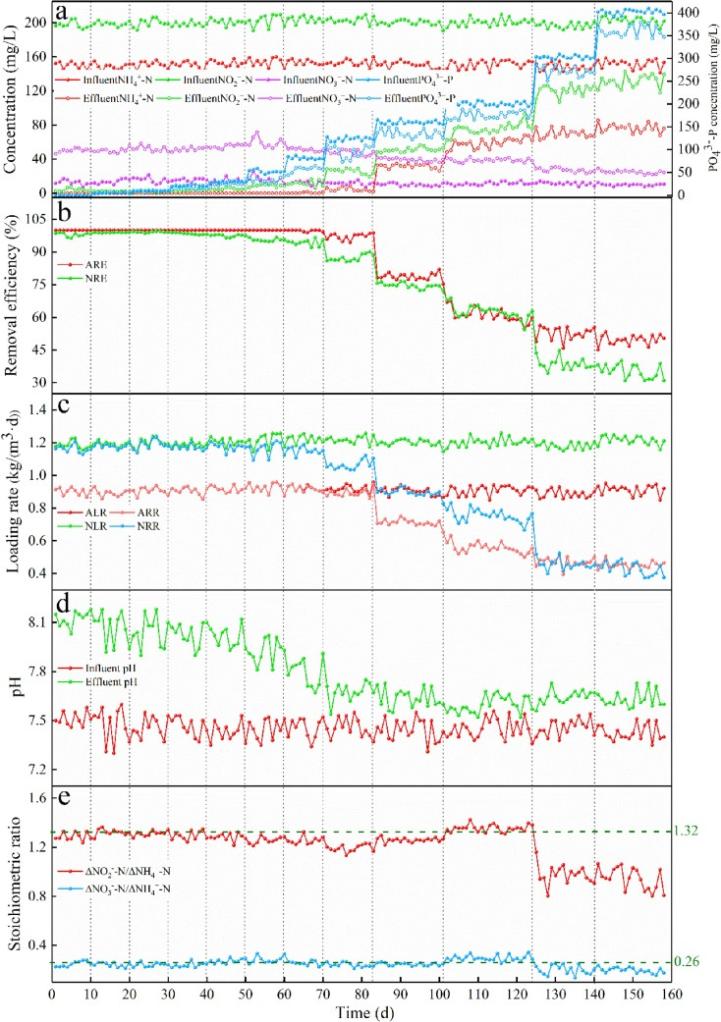 在本研究中,當(dāng)磷酸鹽濃度超過160 mg/L時,氮和磷酸鹽的物質(zhì)平衡被打破,隨著KH2PO4用量的進(jìn)一步增加,進(jìn)水pH值顯著下降。為了使進(jìn)水pH值保持在7.5,加入氫氧化鈉進(jìn)行酸堿中和。隨著氫氧化鈉的注入,在液相中觀察到白色絮狀沉淀。此外,隨著磷酸鹽用量的增加,所需的氫氧化鈉濃度也增加,產(chǎn)生更多的白色絮狀沉淀物,這些白色沉積物會粘附在生物膜上并延遲底物滲透到內(nèi)部生物質(zhì)中,正是由于這些非織造膜載體的存在,MAB可以富集成致密致密的生物膜,而不是漂浮和松散的顆粒。因此,MAB的新細(xì)胞不能以被沉淀覆蓋的顆粒為核,形成更大的顆粒。