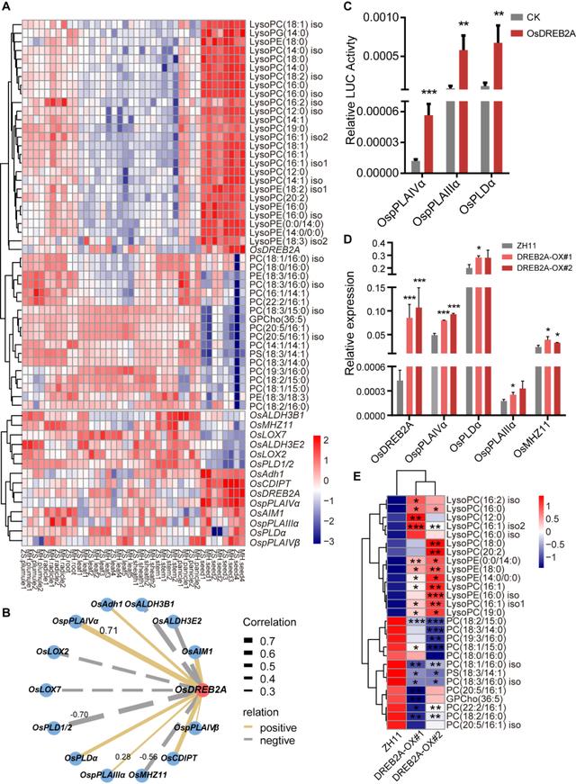 最后,為了進(jìn)一步準(zhǔn)確了解成熟果實(shí)中轉(zhuǎn)錄水平與代謝物變化之間的關(guān)系,作者進(jìn)行了DEGs與DAMs之間的相關(guān)分析,其中,變化趨勢相同的DEGs和DAMs主要涉及類黃酮、酚酸類、氨基酸及其衍生物、萜類、有機(jī)酸、脂類等(圖7)。