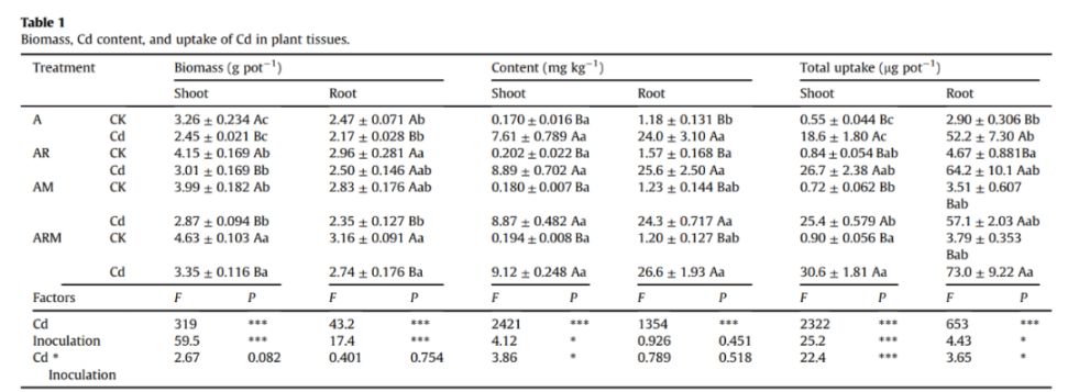添加Cd和接種根瘤菌以及AMF都顯著影響紫花苜蓿生物量,包括芽和根(P<0.01;表1)。此外,接種處理大大提高了紫花苜蓿的芽和根生物量,而添加Cd則顯著降低了紫花苜蓿的芽和根生物量(P<0.01)。例如,在添加Cd的根瘤菌和AMF共同接種的處理中,紫花苜蓿生物量最高(3.35±0.116 g /pot)。此外,紫花苜蓿芽和根中的Cd濃度顯著受Cd添加、接種及其相互作用的影響。接種和Cd處理大大增加了紫花苜蓿芽和根的Cd吸收含量(表1)。與對照(未接種)相比,所有接種處理下根中的Cd含量均高于芽中的Cd含量(P <0.05)。此外,相對于對照而言,在添加Cd后,接種處理芽中的Cd濃度均高出1.2倍。在添加Cd的共同接種處理中,芽中Cd的總吸收量最高(30.6±1.81mg/pot)。與添加Cd的對照(未接種)相比,單獨(dú)接種和共同接種處理的芽中,Cd的總吸收量顯著更高(系數(shù)分別為1.4和1.6),(P <0.05)。在單獨(dú)接種和未接種處理中,根瘤菌和AMF共同接種處理的總Cd吸收量最高。