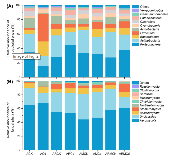 我們的研究在所有不同的處理中檢測到了10個細(xì)菌門類(相對豐度>1%),即變形菌門(Proteobacteria)、放線菌門(Actinobacteria)、擬桿菌門(Bacteroidetes)、厚壁菌門(Firmicutes)、酸桿菌門(Acidobacteria)、藍(lán)藻細(xì)菌門(Cyanobacteria)、綠彎菌門(Chloroflexi)、髕骨細(xì)菌門(Patescibacteria)、芽單胞菌門(Gemmatimonadetes)和疣微菌門(Verrucomicrobia) (圖2A)。相對豐度<1%的其他種群被歸為”Others”。在所有處理中,Bacteroidetes、Actinobacteria、Proteobacteria和Firmicutes是主要的細(xì)菌門。Cd添加、接種及其相互作用顯著影響了Firmicutes、Bacteroidetes和Acidobacteria的相對豐度。特別是Cd的添加,明顯降低了所有接種(AR、AM和ARM)處理中Actinobacteria的相對豐度,而增加了兩個接種(AM和ARM)處理中Firmicutes的相對豐度。