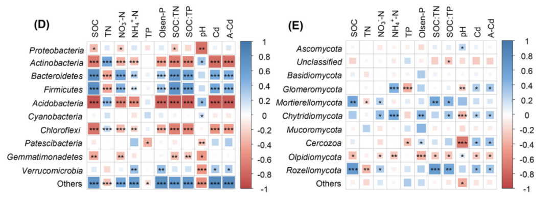 VPA的結(jié)果表明,土壤性質(zhì)和Cd含量一般能解釋細(xì)菌群落的大部分變化(62.8%),而它們只能解釋真菌群落12.9%的變化(圖4A和B)。Mantel檢驗(yàn)和相關(guān)分析表明,除TP和SOC:TP外,其他土壤變量均與細(xì)菌群落顯著相關(guān),而只有Olsen-P和pH值對真菌群落有顯著影響(圖4C)。此外,RDA還證實(shí),與不同處理的真菌群落相比,土壤變量對不同處理的細(xì)菌群落有更明顯的影響。根據(jù)相關(guān)性熱圖和RDA或CCA,細(xì)菌群落中的Actinobacteria、Bacteroidetes、Firmicutes、Acidobacteria和Chloroflexi與除TP外的其他土壤變量顯著相關(guān)(P<0.05;圖4D)。然而,在真菌群落中,只有Chytridiomycota、Olpidiomycota和Rozellomycota與大多數(shù)土壤變量表現(xiàn)出明顯的相關(guān)性(P <0.05;圖4E)。