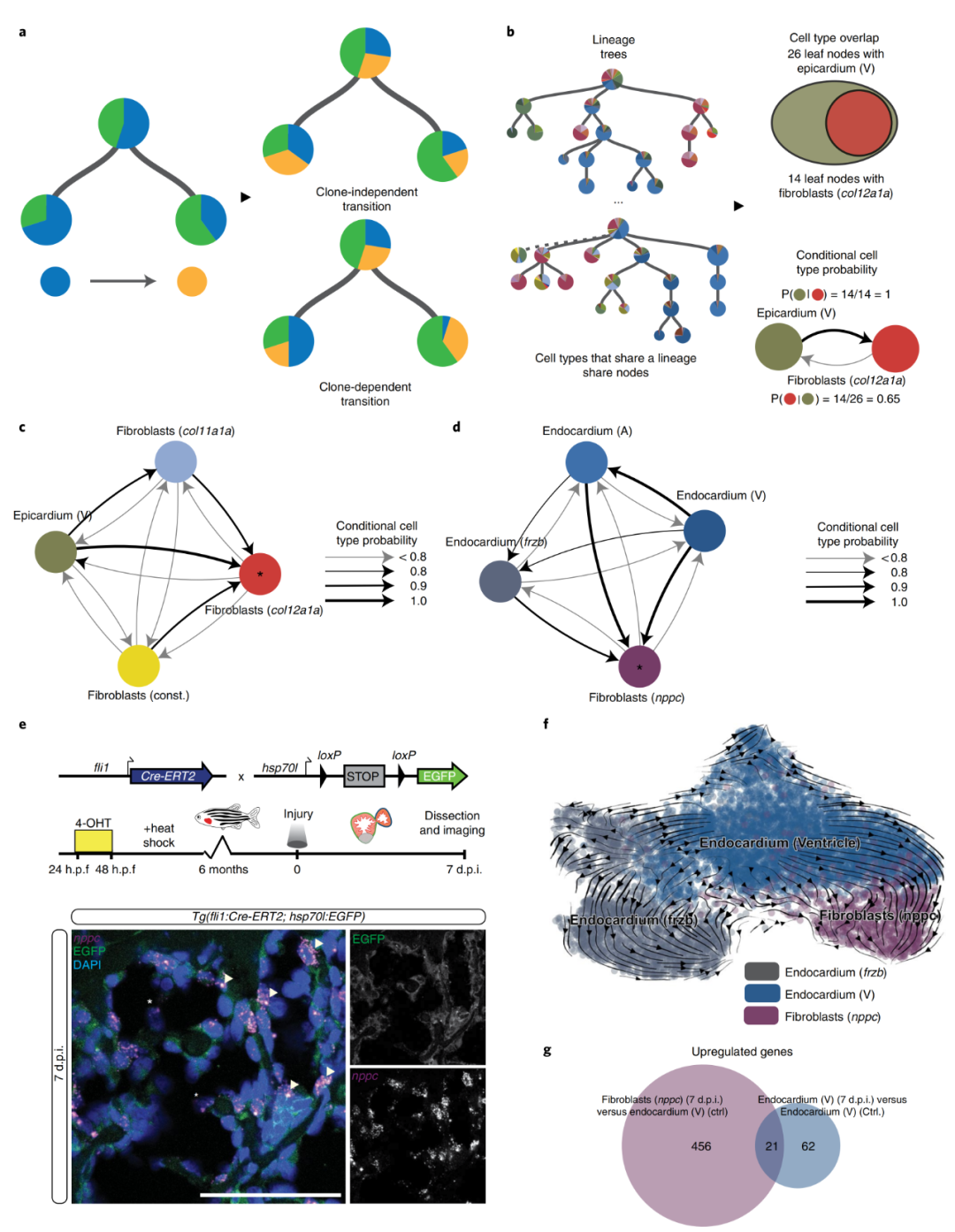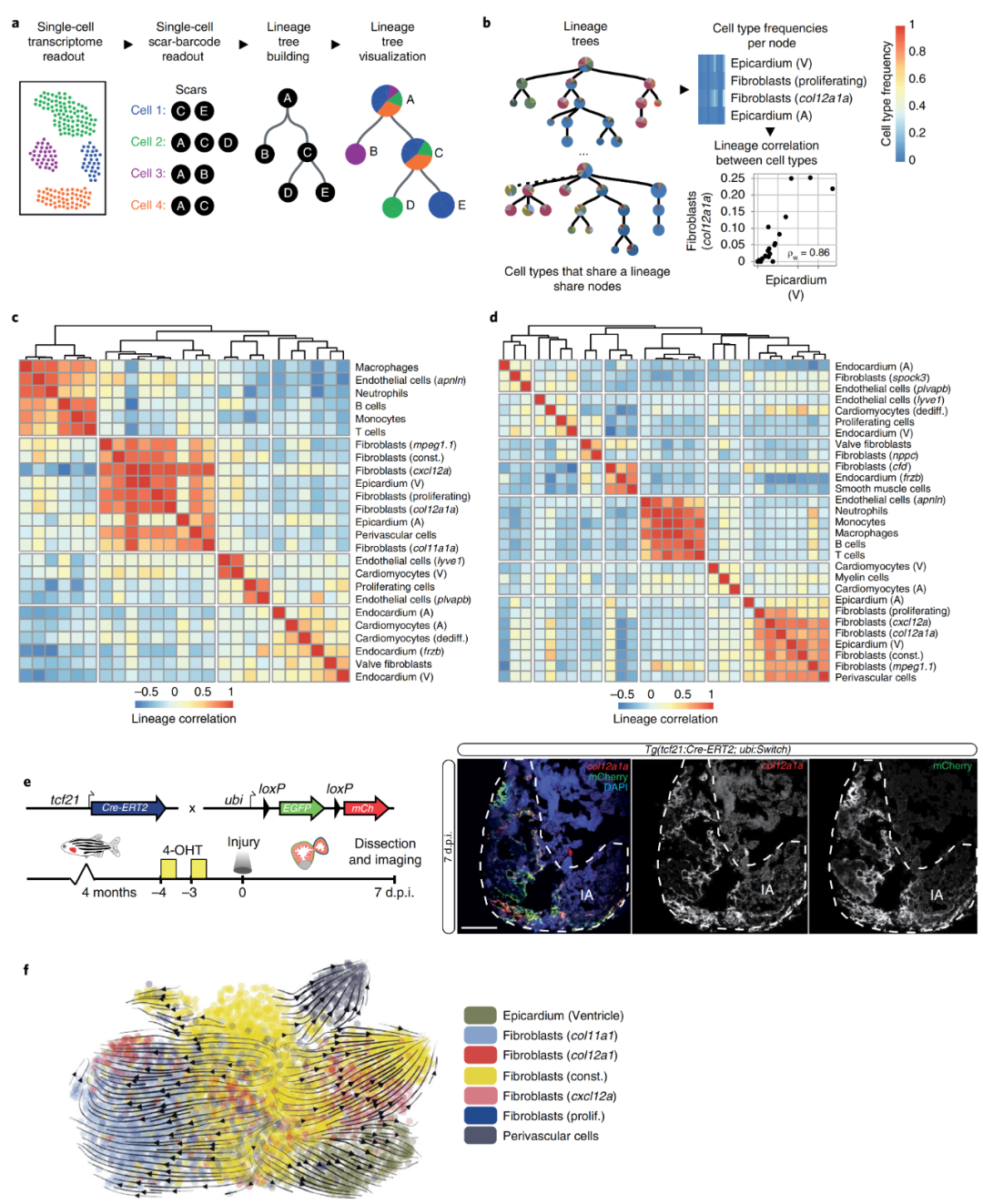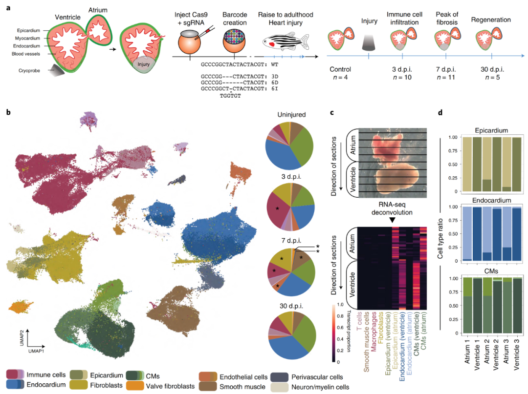 為了系統(tǒng)地識別健康和再生斑馬魚心臟中的細(xì)胞類型,作者對損傷前后不同階段的大約20萬個解離細(xì)胞進(jìn)行了scRNA-seq(圖1a)。為了準(zhǔn)確得到細(xì)胞發(fā)育起源的相關(guān)信息,作者還應(yīng)用了一種基于CRISPR–Cas9技術(shù)的大規(guī)模平行譜系追蹤方法,通過注射Cas9和針對多拷貝轉(zhuǎn)基因(斑馬魚系中的dTomato:一種用于斑馬魚細(xì)胞追蹤和譜系分析的多光譜細(xì)胞標(biāo)記)的sgRNA,創(chuàng)建了作為譜系條形碼的“遺傳疤痕”來記錄早期發(fā)育中的譜系關(guān)系。