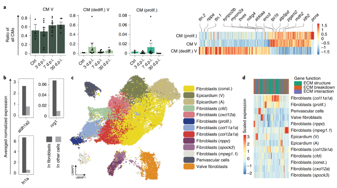 作者注意到心臟再生中三個成熟的信號因子在成纖維細(xì)胞中高度富集:合成視黃酸的酶aldh1a2、心肌細(xì)胞有絲分裂原nrg1和再生細(xì)胞外基質(zhì)(ECM)因子fn1a(圖2b)。為了更詳細(xì)地研究心臟成纖維細(xì)胞的多樣性,作者對成纖維細(xì)胞進(jìn)行了亞群聚類。結(jié)果顯示出驚人的多樣性,有13個轉(zhuǎn)錄上不同的成纖維細(xì)胞聚類(圖2c)。這13個基因簇在ECM相關(guān)基因的表達(dá)譜上表現(xiàn)出明顯的差異(圖2d),但它們的轉(zhuǎn)錄組多樣性遠(yuǎn)不止于此——去除ECM相關(guān)基因后,可以高精度鑒定相同的成纖維細(xì)胞亞型。