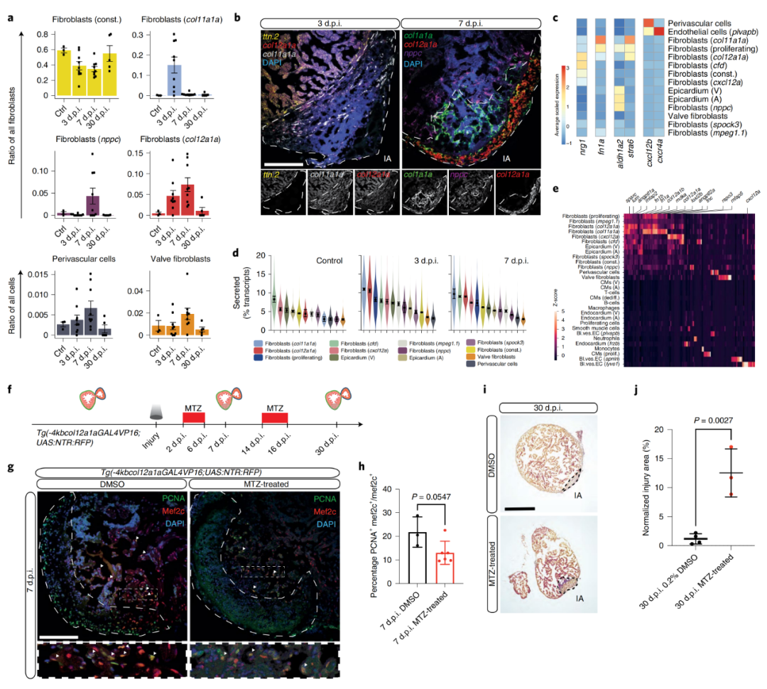 雖然作者對單細(xì)胞基因表達(dá)譜的時空分析強(qiáng)烈表明了瞬時成纖維細(xì)胞的再生功能,但還需要額外的實(shí)驗(yàn)來驗(yàn)證這一假設(shè)。為了從功能上評估瞬時col11a1a和col12a1a成纖維細(xì)胞的作用,作者使用硝基還原酶/甲硝唑(NTR/MTZ)系統(tǒng)進(jìn)行靶向細(xì)胞剔除。在MTZ處理后的轉(zhuǎn)基因系Tg(-4kbcol12a1a:GAL4VP16;UAS:NTR:RFP)中,在7 d.p.i.時相較于對照,5 / 6的心臟顯示心肌細(xì)胞增殖減少,col12aa表達(dá)細(xì)胞減少(圖3g,h)。在30d.p.i.時,col12a1+細(xì)胞剔除顯著損害心臟再生(圖3i,j)。總之,作者確定了心臟再生過程中具有潛在再生作用的三種成纖維細(xì)胞狀態(tài):col11a1a、col12a1a和nppc成纖維細(xì)胞?;蚣?xì)胞剔除數(shù)據(jù)強(qiáng)烈表明col12a1a表達(dá)細(xì)胞在再生生態(tài)位中發(fā)揮了作用。