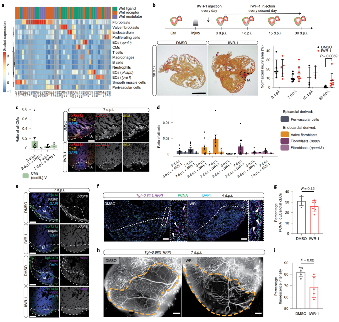 為了評估血管再生,作者對4d.p.i.下冠脈內(nèi)皮細(xì)胞(cECs)的增殖以及7 d.p.i.損傷區(qū)冠狀動脈的覆蓋范圍進(jìn)行了定量分析。發(fā)現(xiàn)注射IWR-1后,cEC增殖在4 d.p.i.時有邊緣但不顯著的下降(圖6f,g)。然而,在7d.p.i.時,損傷區(qū)冠狀動脈覆蓋明顯減少(圖6h,j)。這些結(jié)果表明,Wnt抑制后觀察到的心臟再生減少至少部分是由血管再生缺陷介導(dǎo)的。這種缺陷似乎不是由cECs增殖減少引起的,而可能與血管再生的其他方面有關(guān)。