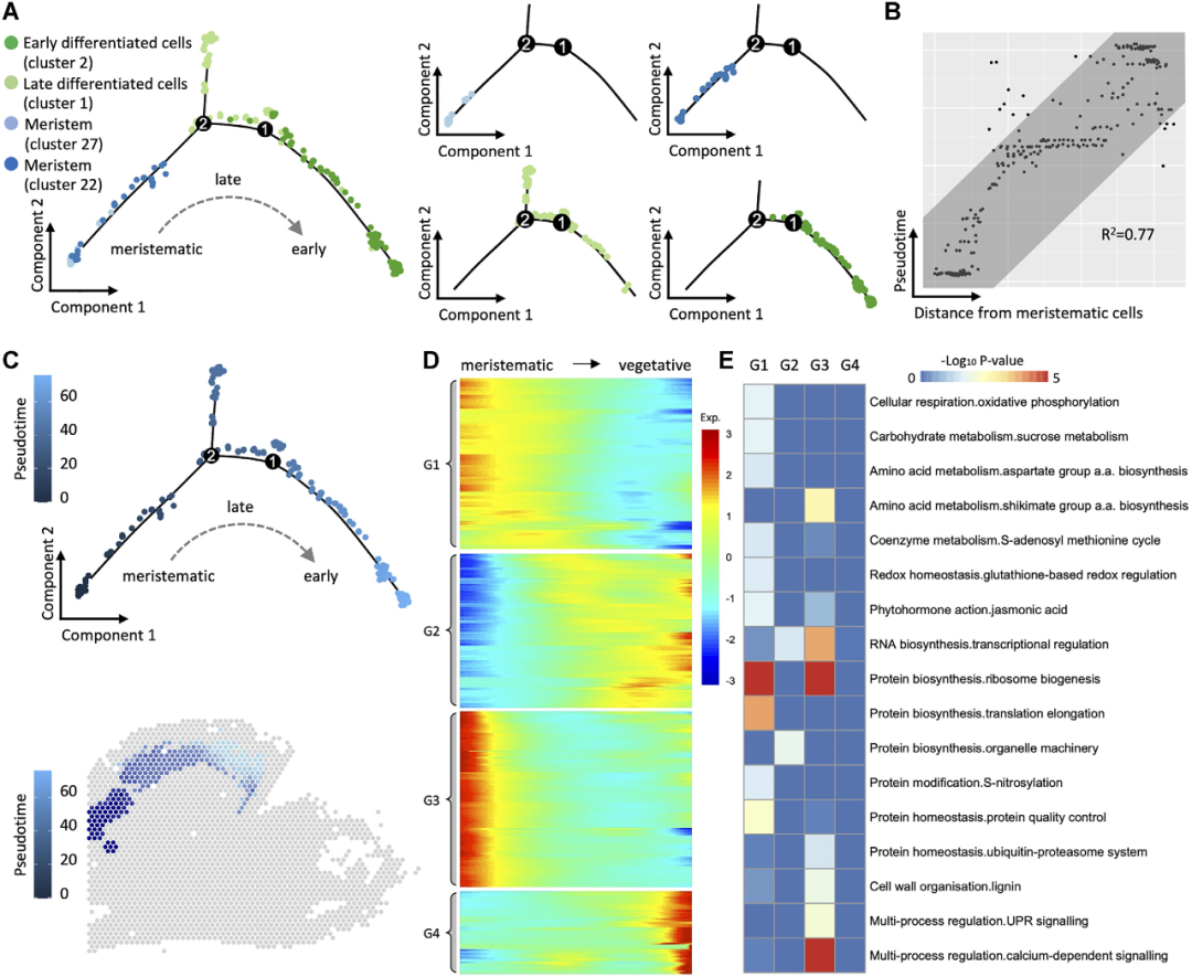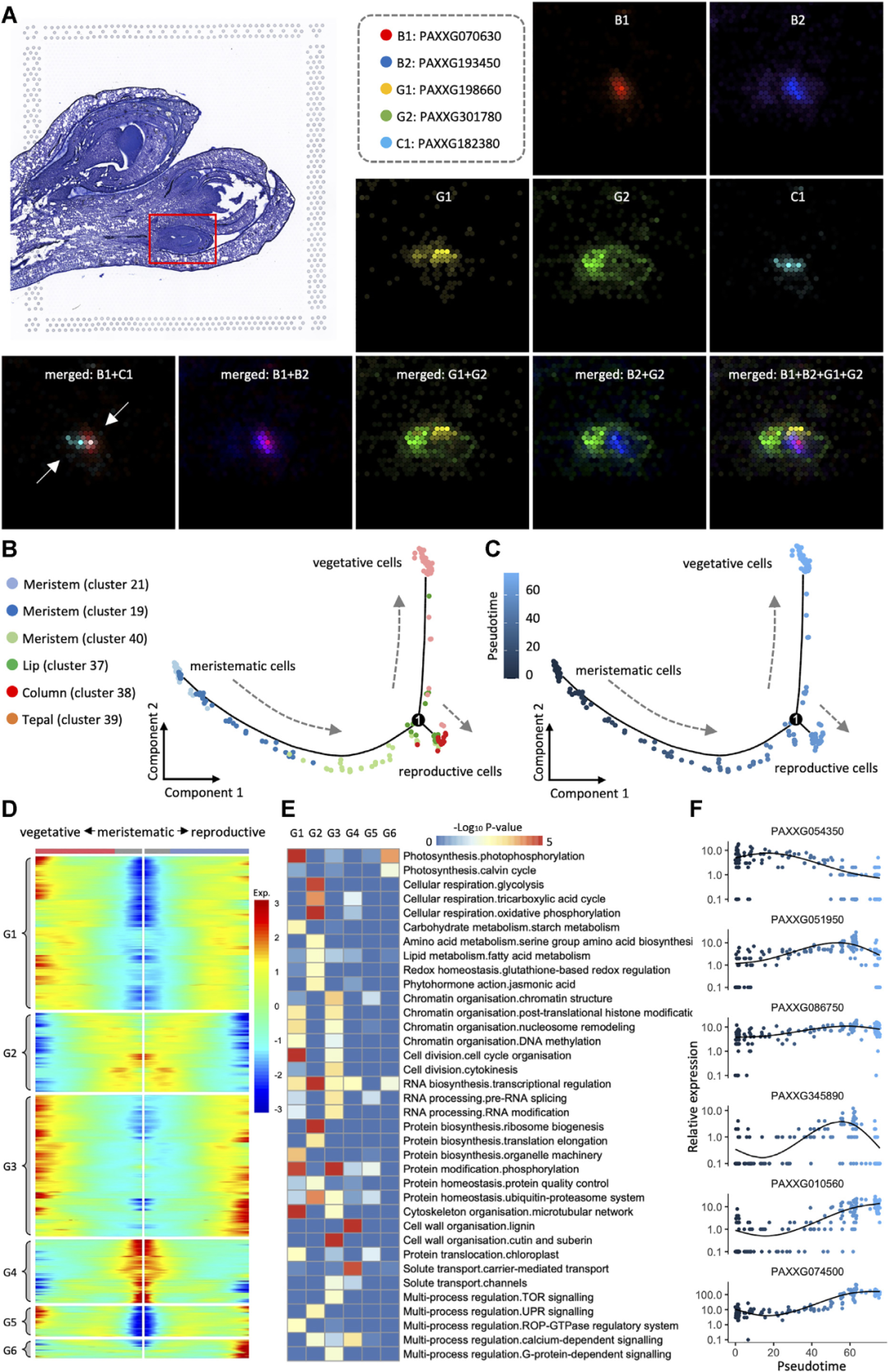 為了研究從分生組織細(xì)胞到營養(yǎng)型細(xì)胞(花被、唇瓣)和生殖細(xì)胞(花柱)的分化,研究團(tuán)隊(duì)用Monocle繪制了細(xì)胞狀態(tài)的軌跡。如圖2B所示,三簇分生組織細(xì)胞形成了一條連續(xù)的路徑,代表其發(fā)育過程,與其在組織學(xué)切片上的位置高度一致。該路徑分為兩條子路徑:一條是由花被片中的營養(yǎng)型細(xì)胞組成,另一條由花柱中的花藥原基生殖細(xì)胞組成。細(xì)胞類型變化的軌跡作為動態(tài)發(fā)育過程的靜態(tài)投影,也可以理解為分生組織細(xì)胞的擬時序分化。如圖2C所示,此時營養(yǎng)型細(xì)胞出現(xiàn)較早,并分散在子路徑的遠(yuǎn)端。共鑒定出4,685個空間差異基因與發(fā)育擬時間相關(guān),對這些基因繪制分支軌跡基因表達(dá)熱圖,發(fā)現(xiàn)它們隨著發(fā)育路徑的分離表現(xiàn)出不同的表達(dá)模式(圖2D)。MapMan功能富集圖顯示它們主要富集在細(xì)胞壁代謝、激素、脂質(zhì)、蛋白質(zhì)和RNA合成等功能上(圖2E)。通過基因的擬時分布圖發(fā)現(xiàn)許多其他基因可能在分生組織、營養(yǎng)組織和生殖組織的細(xì)胞分化過程中發(fā)揮作用(圖2F)。