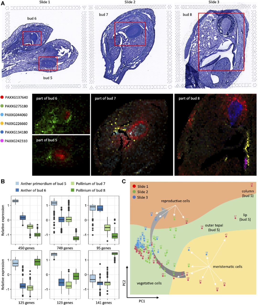 研究結(jié)果為了提供花器官發(fā)生的時空細(xì)胞圖譜,以便全面理解器官發(fā)生的復(fù)雜過程,本研究在10×?Visium平臺上對蝴蝶蘭(P. Big Chili)三個總狀花序組織樣本的矢狀面進(jìn)行了空間轉(zhuǎn)錄組測序,從時期上覆蓋了花序分生組織存在到接近成熟的花器官的大部分早期發(fā)育階段(圖1A)。研究團(tuán)隊(duì)利用自主開發(fā)的STEEL算法,將空間轉(zhuǎn)錄組數(shù)據(jù)清晰地分為40個clusters(圖1B、C)。其中,花被片、唇瓣和花柱組織中的beads聚類性較好,且與相應(yīng)的組織形態(tài)學(xué)檢測的觀察結(jié)果高度一致。 總之,三張切片的空間轉(zhuǎn)錄組共檢測到14,328個基因的表達(dá),其中有3,817個基因被鑒定為特異性或優(yōu)先在一個或多個組織中表達(dá),為后續(xù)詳細(xì)分析從分生組織細(xì)胞到分化后細(xì)胞的細(xì)胞類型變化提供了分子圖譜。