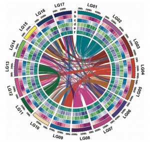 作者對野生枇杷(Eriobotrya japonica?Lindl.)(2n = 34)的基因組進(jìn)行了研究,與流式細(xì)胞儀預(yù)估的結(jié)果(~760Mb)相一致,k-mer分析結(jié)果顯示基因組大小為737.06 Mb。隨后,利用152.6 Gb的ONT數(shù)據(jù)(reads N50 = 31.6kb)進(jìn)行基因組組裝,同時利用二代數(shù)據(jù)糾錯和Hi-C數(shù)據(jù)掛載,成功組裝了分布在17條染色體上的783.7 Mb的野生枇杷基因組序列(圖1);其中,scaffold N50和contig N50分別為41.8Mb和3.9Mb。二代轉(zhuǎn)錄組的回比率為98.7%,CEGMA和BUSCO評估分別為98.03%和98.27%,表明GZ-23基因組組裝的完整性較好(表1)。進(jìn)而結(jié)合從頭預(yù)測、同源比對預(yù)測和轉(zhuǎn)錄組輔助預(yù)測,共預(yù)測到45,791個基因,鑒定到59.75%的基因組重復(fù)序列,此外,還鑒定出5381個rRNAs、765個tRNAs和129個miRNAs。