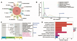 為研究野生枇杷基因組特征及進(jìn)化,作者將其與藍(lán)星睡蓮、水稻、鐵皮石斛、番茄,茶樹、獼猴桃、蘋果、白梨、野草莓、擬南芥,杧果和葡萄基因組進(jìn)行比較基因組分析,通過基因家族聚類,發(fā)現(xiàn)92%(42,150)的蛋白編碼基因聚為20,668個基因家族,其中523個基因家族為枇杷特有的單拷貝(圖2A),主要參生物學(xué)質(zhì)量調(diào)控、激素水平、定位、運(yùn)輸和生長素極性運(yùn)輸?shù)壬镞^程。通過4DTv和Ks對全基因組復(fù)制事件分析表明,枇杷基因組中發(fā)生了兩次全基因組復(fù)制(WGD)事件,最近的WGD事件發(fā)生在30-45 Mya,而古WGD可能發(fā)生在已知的約120~130 Mya的古六倍化WGT(γ)事件。系統(tǒng)分化表明,枇杷與蘋果和梨擁有共同的祖先,這三個物種的分化發(fā)生在最近的一次WGD事件之后,通過比較分析,枇杷基因組104個基因家族發(fā)生擴(kuò)張,僅有一個基因家族發(fā)生收縮,GO富集分析表明,發(fā)生擴(kuò)張的基因家族主要參與花粉識別、分生組織發(fā)育與維持、免疫反應(yīng)、和DNA代謝過程的調(diào)節(jié)等生物過程;KEGG分析表明,主要參與半乳糖代謝、氨基酸代謝、氨基糖/核苷酸糖代謝、氮代謝、不飽和脂肪酸生物合成等通路。收縮的基因家族的生物學(xué)過程只參與了蛋白質(zhì)磷酸化。