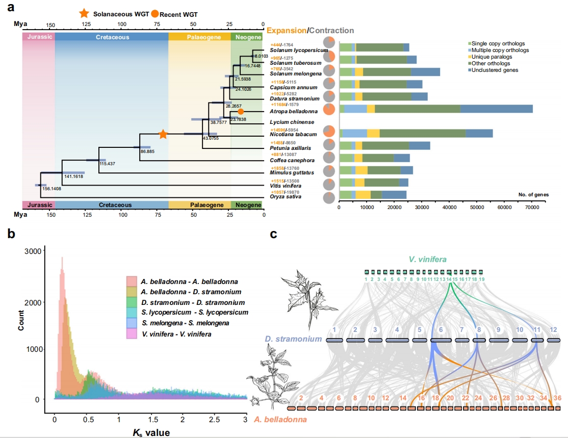 作者利用顛茄和曼陀羅,以及8個茄科物種和4種其他被子植物的207個單拷貝基因進(jìn)行系統(tǒng)發(fā)育分析。結(jié)果表明:顛茄和枸杞屬于一個分支,而曼陀羅、辣椒、茄子、番茄和馬鈴薯屬于另一個分支,估計矮牽牛在約43Mya(33-56Mya)從茄科物種分化而來,曼陀羅在約28Mya(23-37Mya)由順茄和枸杞組成的分支分化而來,而顛茄在大約24Mya(18-31Mya)從枸杞分化而來。Ks分析顯示,茄科物種與其他高等雙子葉植物共享較古老的伽馬古多倍體事件。對顛茄、曼陀羅和葡萄進(jìn)行基因組共線性分析,對于葡萄基因組的各個區(qū)域,通常在曼陀羅基因組中能鑒定出3個與之匹配的區(qū)域,并且在顛茄和曼陀羅之間也有相似的現(xiàn)象。