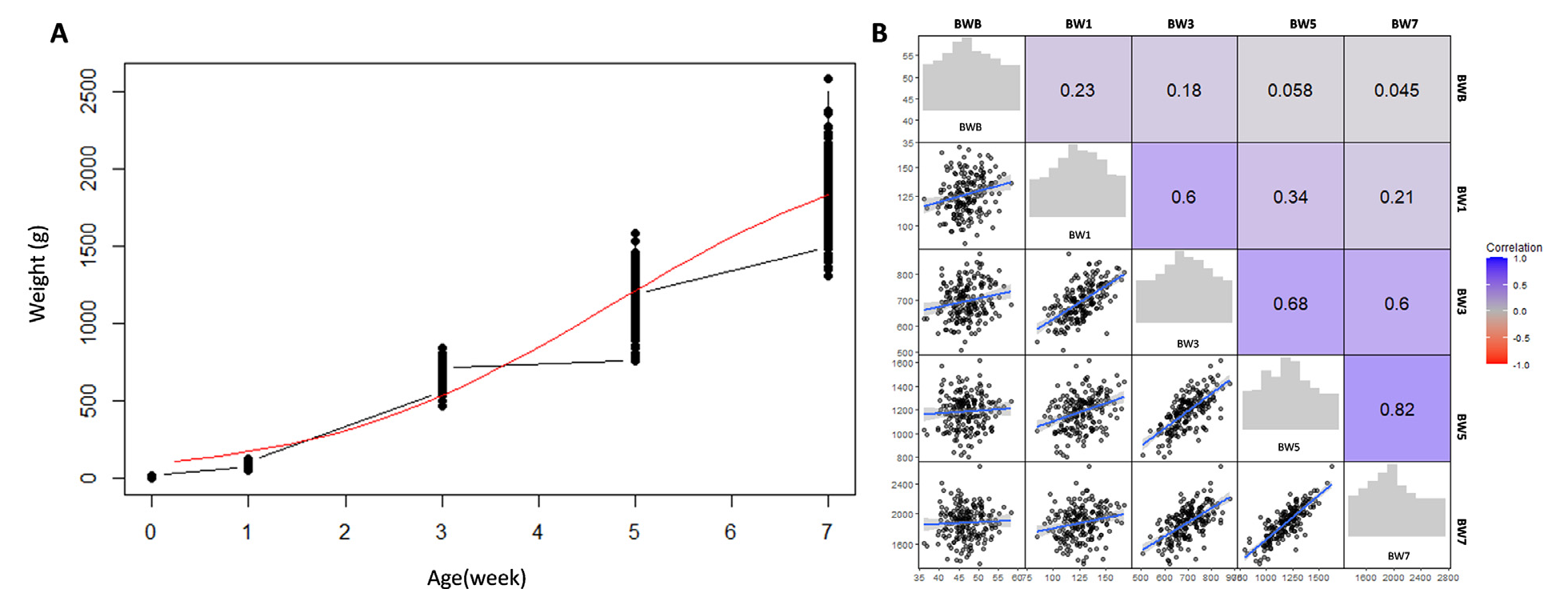 該研究對金陵白鴨(n = 201)在不同時期的體重進行統(tǒng)計,BWB、BW1、BW3、BW5和BW7的體重均值分別為46.93g、127.19g、697.17g、1182.43g和1,888.52g。生長曲線結(jié)果顯示:金陵白鴨第3周-第5周生長最快,第5周后生長放緩。體重的分散度隨著年齡和體重的增加而增加。相鄰2周的體重之間存在較強的相關(guān)性,BW3與BW1(r = 0.6)、BW5(r = 0.68)和BW7(r = 0.6)顯著正相關(guān),BW5與BW7顯著正相關(guān)(r = 0.82)。但隨著時間間隔的延長,性狀間的相關(guān)性降低,BW1與BW7的相關(guān)性不顯著(r = 0.21),BWB則與BW3 (r = 0.18), BW5 (r = 0.058),BW7 (r = 0.45)均不顯著相關(guān)。