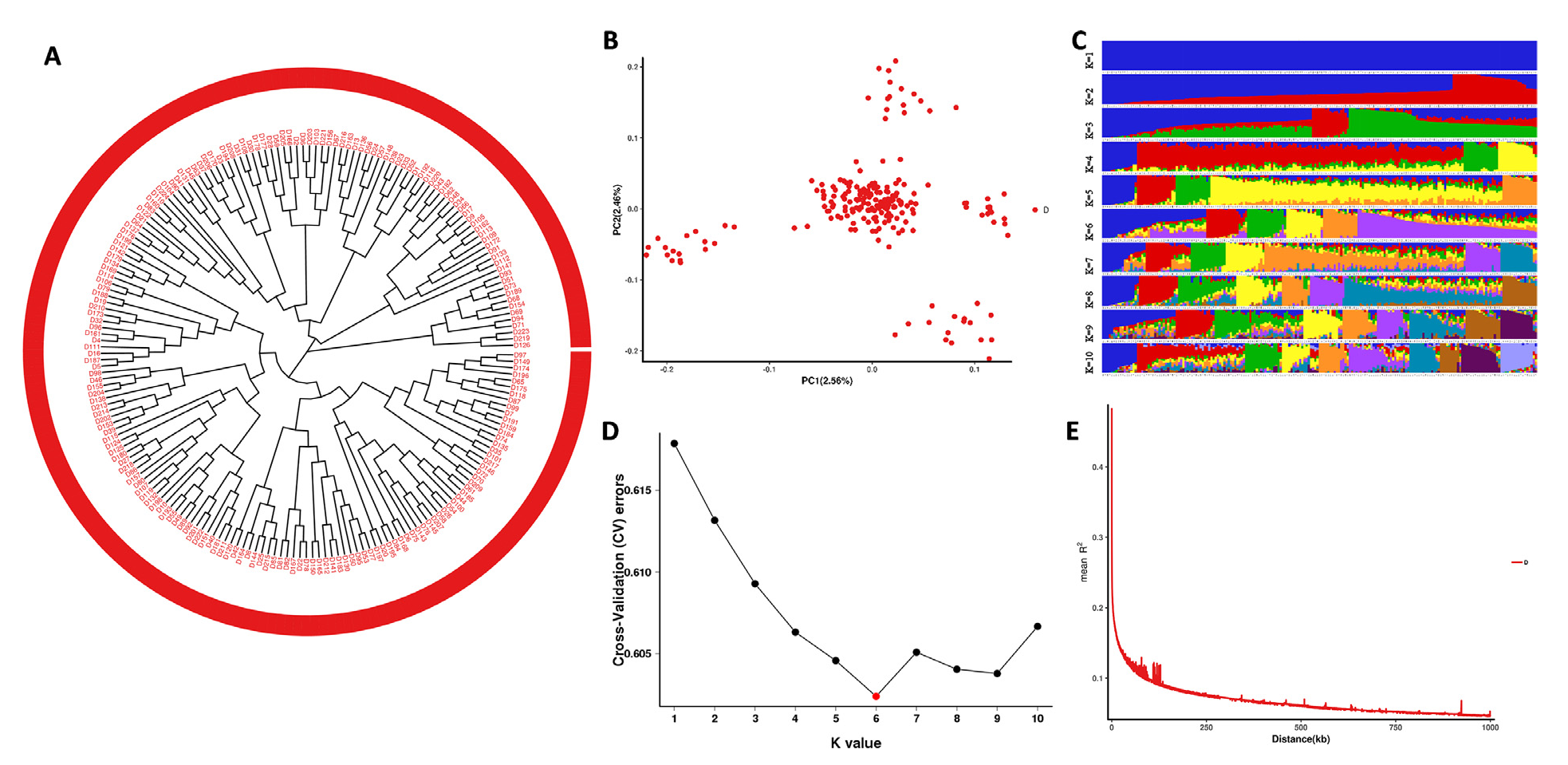 進化分析:進化樹構(gòu)建;群體結(jié)構(gòu)分析;PCA分析;LD衰減分析等