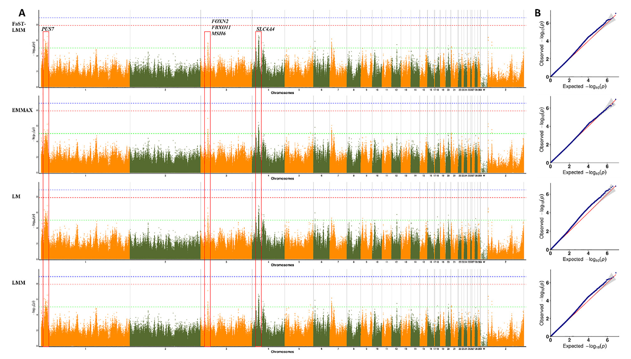 作者對出生體重(BWB)、1周體重(BW1)、3周體重(BW3)、5周體重(BW5)和7周體重(BW7)進行了全基因組關(guān)聯(lián)分析,4種統(tǒng)計模型比較研究表明,F(xiàn)aST-LMM表現(xiàn)出最優(yōu)的效率,產(chǎn)生更多的結(jié)果和最小的假陽性。