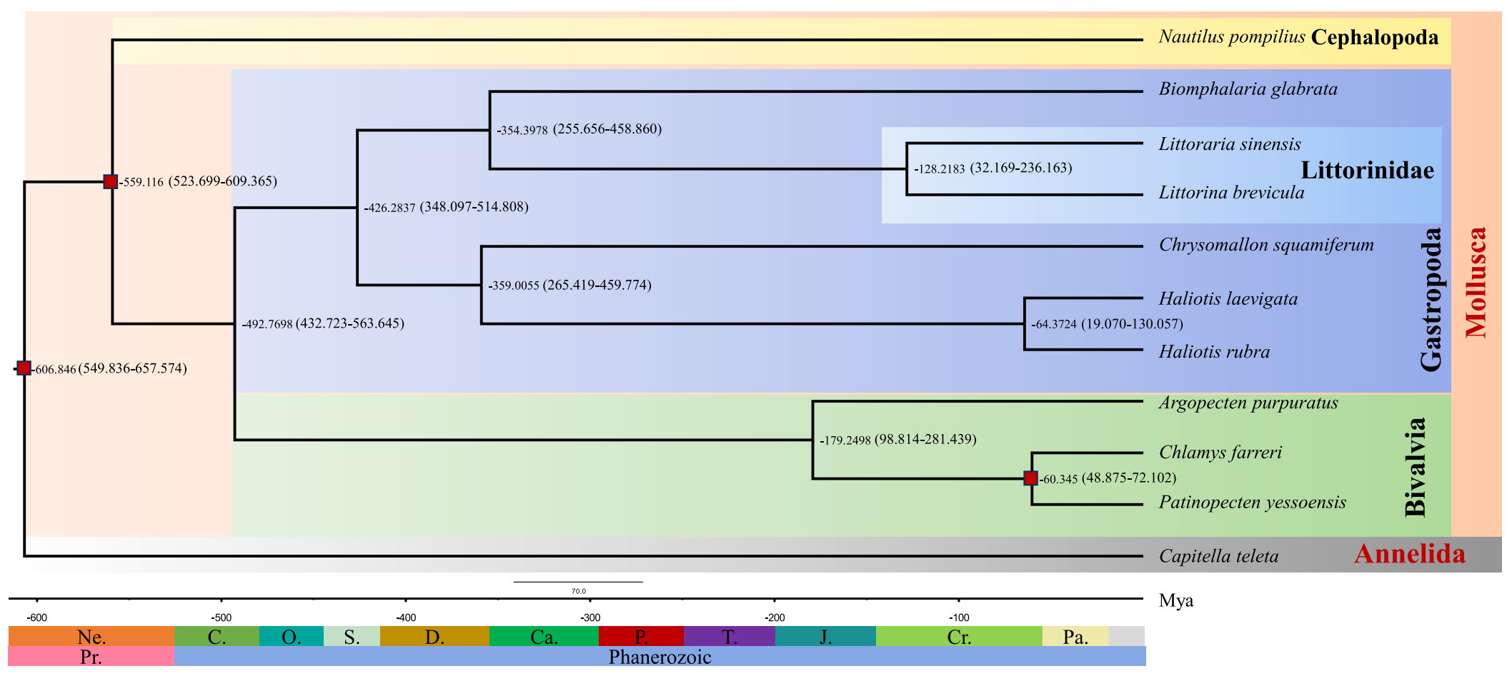 通過比較基因組學分析構(gòu)建了包括兩種濱螺在內(nèi)的11個物種的系統(tǒng)發(fā)育樹,并估算兩種濱螺的分化時間大約在128.22Mya前。進一步的研究結(jié)果表明與刺激反應(yīng)、代謝過程、先天免疫和抗氧化反應(yīng)相關(guān)的基因或基因家族可能在濱螺應(yīng)對潮間帶多種環(huán)境因子脅迫的過程中發(fā)揮著重要作用,受損核酸和蛋白的修復或降解可能是濱螺在多重壓力下抵抗細胞凋亡、維持細胞內(nèi)穩(wěn)態(tài)的主要方式。相關(guān)研究結(jié)果為潮間帶無脊椎動物適應(yīng)性進化分子機制的后續(xù)研究提供了基礎(chǔ)。