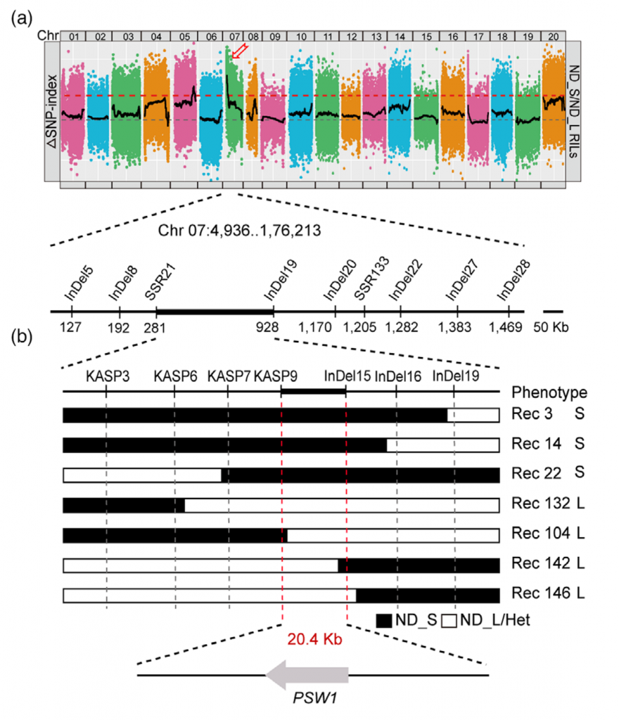 花生莢果大小是決定花生產(chǎn)量的關(guān)鍵農(nóng)藝性狀,為了鑒定控制花生莢果大小的基因,該研究對188份核心種質(zhì)進行鑒定,并選取莢果大小/重量差異顯著的2份花生材料構(gòu)建F2群體,BSA-Seq獲得了288.58 Gb的原始數(shù)據(jù)。利用285914個高質(zhì)量SNPs 和70 759個 InDel,將控制莢果大小的基因定位在07染色體1.17 Mb的區(qū)間內(nèi)。作者從F6:7和F6:8群體中開發(fā)了15個多態(tài)性標記并對個體進行基因分型,精細定位QTL到KASP 9 和In Del15之間20.4 kb的區(qū)間內(nèi)。該區(qū)間僅包含1個預測的非同義突變基因和InDels,將該基因命名為PSW1。
