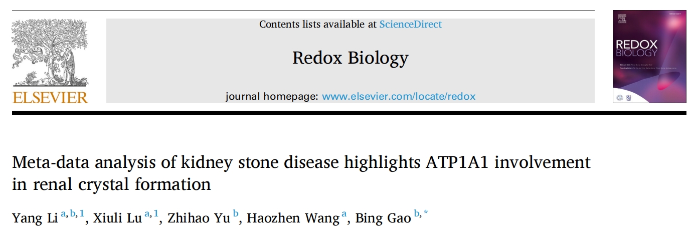 Li Y, Lu X, Yu Z, Wang H, Gao B. Meta-data analysis of kidney stone disease highlights?ATP1A1?involvement in renal crystal formation.?Redox Biol. 2023 May;61:102648. doi: 10.1016/j.redox.2023.102648. Epub 2023 Feb 27. PMID:36871182.