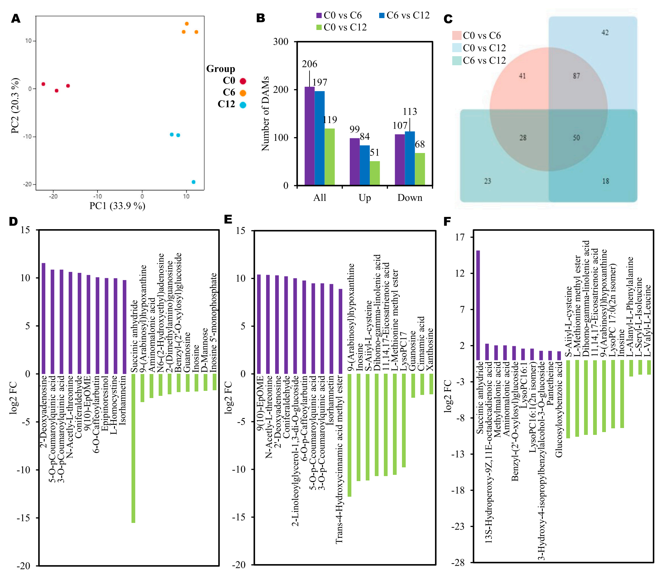 在C0和C12中,9(10)- epOME、n -乙酰- L-蘇氨酸、2 ‘ -脫氧腺苷、5- O -對香豆?;鼘幩?、2-亞麻油基甘油-1,3-二- O -糖苷、松木醛、6- O -對咖啡?;芄?、異鼠李素、3-O-對香豆?;鼘幩岷头词?4-羥基肉桂酸甲酯在C12組中含量較高。相反,9-(阿拉伯糖基)次黃嘌呤、肌苷、S – aiiyl -L -半胱氨酸、8,11,14-二十烷三烯酸甲酯、L-蛋氨酸甲酯、LysoPC17:0、鳥苷、肉桂酸、11、14、17-二十碳三烯酸和黃嘌呤在C0組中表現(xiàn)出更高的豐度(圖2F)。