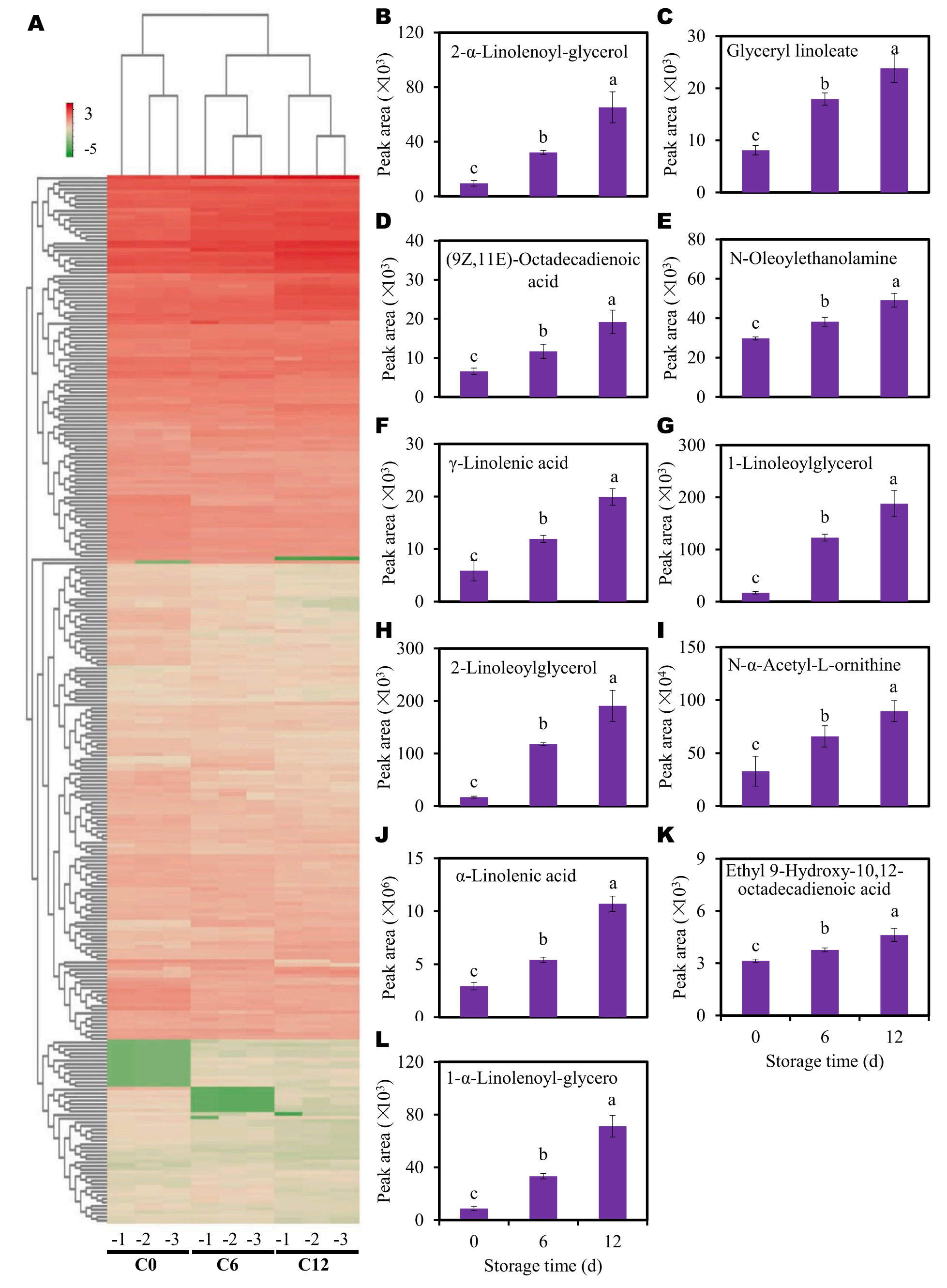 為進一步分析代謝物在9個樣本的積累模式,該研究進行了聚類熱圖分析。結(jié)果顯示,隨著貯藏時間的延長,褐變程度逐漸增加,推測持續(xù)增加的DAMs可能有助于切片芋頭的褐變或促進其褐變過程。因此,該研究關(guān)注分析在褐變過程中豐度持續(xù)上升的DAMs (圖3B-L)。確定了11個DAMs在褐變過程中豐度持續(xù)增加,如2-α-亞麻烯酰甘油、甘油亞油酸、(9Z,11E)-十八烯二烯酸、N-油基乙醇胺、γ-亞麻酸、1-亞麻油基甘油、2-亞麻油基甘油、N-α-乙?;? L-鳥氨酸、α-亞麻酸、9-羥基-10、12-十八烯二烯酸和1-α-亞麻烯酰甘油。值得注意的是,在這11個DAMs中,有10個是脂肪酸或脂質(zhì)衍生物。幾種褐變指標(biāo)與這些水DAMs之間的相關(guān)系數(shù)非常高。這些結(jié)果表明,在切片芋頭中脂質(zhì)代謝與褐變發(fā)展之間存在潛在的聯(lián)系。