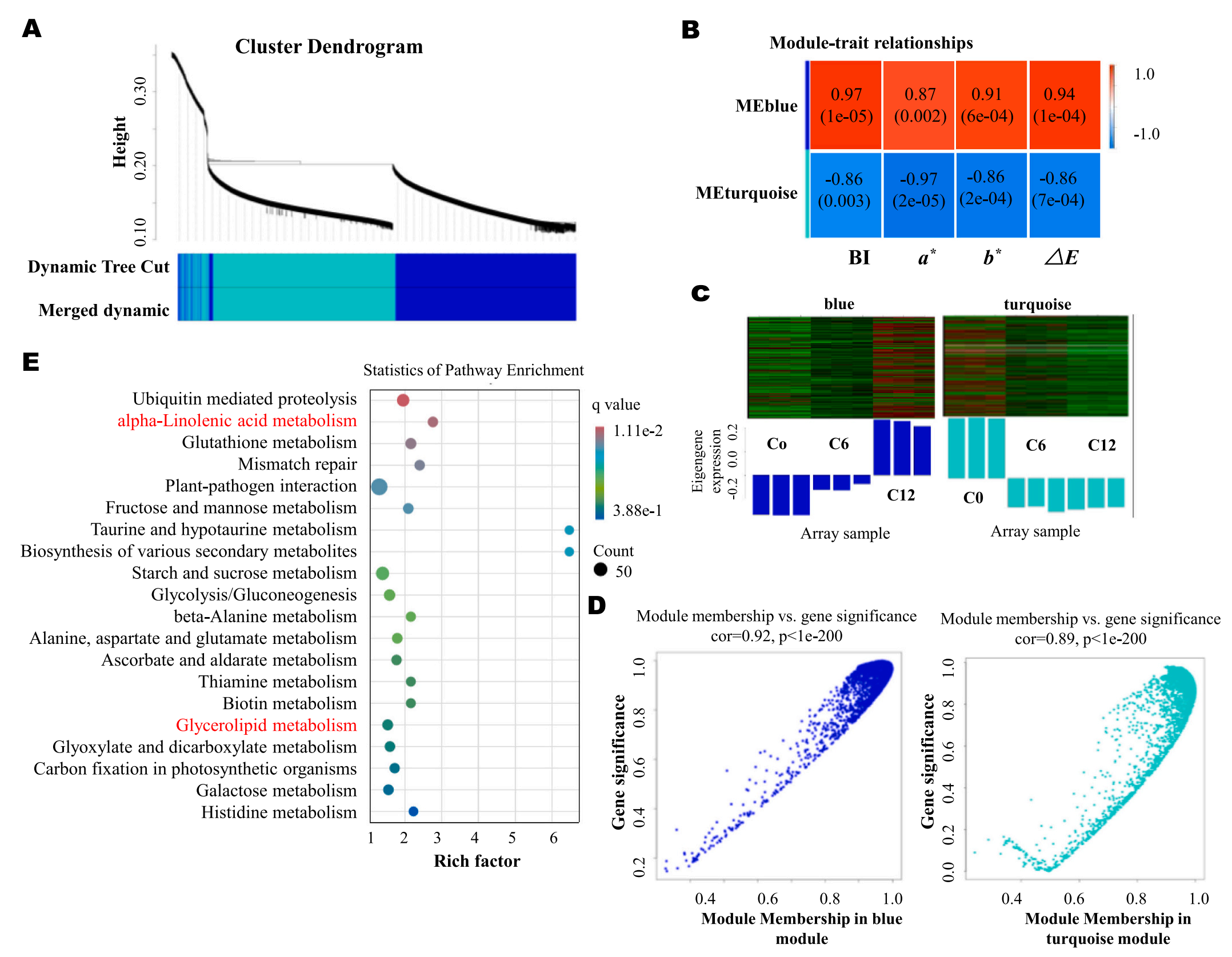 為了進一步研究脂質(zhì)代謝與冷藏芋頭切片褐變之間的關(guān)系,研究采用WGCNA分析進行研究。如圖5A所示,鑒定出兩個與切片芋頭在冷藏期間褐變發(fā)育顯著相關(guān)的模塊。藍色模塊中基因與褐變BI、a*、b*、△E 4項指標(biāo)呈正相關(guān),而綠松石模塊中基因與褐變指標(biāo)呈負(fù)相關(guān)(圖5B)。此外,隨著褐變的發(fā)展,藍色模塊中基因的表達量逐漸增加,而綠松石模塊中基因的表達量逐漸減少(圖5C)。此外,藍色和綠松石模塊中每個基因與褐變的相關(guān)性都很高(圖5D),說明這兩個模塊的基因與冷藏芋頭片的褐變發(fā)育高度相關(guān)。