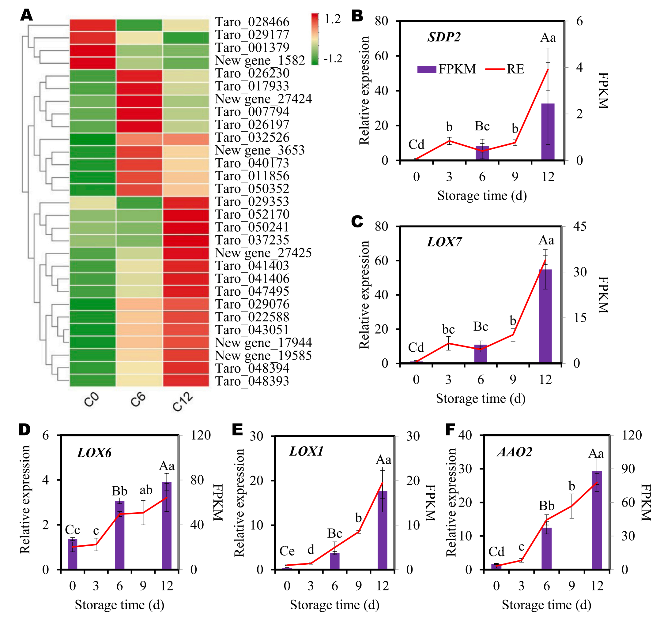 為了驗證RNA-seq數(shù)據(jù)的質(zhì)量,研究檢測了亞麻酸代謝途徑中DEGs的表達模式。在切片芋頭褐變過程中,該途徑中的DEGs差異表達(圖6A)。在這些基因中,4個基因(taro_028466、029177、001379和new gene_1582)的表達量在第6天較0天下降(圖6A)。10個基因(taro_026230、017933、007794、026197、032526、040173、011856、050352以及new gene_27424和3563)的表達量在第6天出現(xiàn)了增加,隨后又出現(xiàn)了下降。然而,這些基因在第12天的表達水平仍然高于第0天(圖6A)。其余15個基因在褐變過程中表現(xiàn)出穩(wěn)定的表達增加。這些結(jié)果再次證實了亞麻酸代謝參與了芋頭褐變過程。