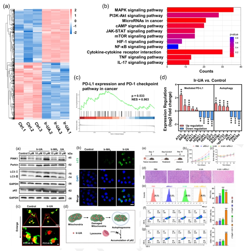 為了證明Ir-UA對PD-L1表達的強大調(diào)節(jié)能力,研究團隊進行了轉(zhuǎn)錄組分析,并比較了Ir-UA處理前后的基因表達情況,KEGG分析結(jié)果表明,癌癥進展的各種途徑顯著變化。例如,在Ir-UA處理后觀察到與PD-L1表達高度相關(guān)的信號通路,如磷脂酰肌醇3-激酶(PI3K)-AKT信號通路、Janus激酶/信號傳感器和轉(zhuǎn)錄激活因子(JAKSTAT)信號通路、絲裂原活化蛋白激酶(MAPK)信號通路等。此外,還檢測到控制先天或適應(yīng)性免疫細(xì)胞的信號通路,如核因子-κB(NF-κB)信號通路、細(xì)胞因子?細(xì)胞因子受體相互作用,白細(xì)胞介素17(IL-17)信號通路,腫瘤壞死因子信號通路等,它們對從“冷腫瘤”向“熱腫瘤”的轉(zhuǎn)變和克服αPD-L1耐藥性起到了重要作用。GSEA結(jié)果顯示吞噬小體和OXPHOS顯著富集,提示Ir-UA可能觸發(fā)自噬小體的形成并抑制OXPHOS。值得注意的是,包括ATF3在內(nèi),癌癥中的PD-L1的表達和PD-1檢查點通路也顯著富集,這些結(jié)果證實了IrUA增強了PD-L1相關(guān)基因的轉(zhuǎn)錄。細(xì)胞毒性評估結(jié)果顯示,與A549細(xì)胞相比,Ir-UA對正常HLF細(xì)胞的半抑制濃度高了5倍,據(jù)推測,利用PD-L1作為治療靶點,可能通過選擇性地調(diào)節(jié)TME中的免疫反應(yīng)來降低毒性。與Ir-NH2相比較,Ir-UA的親脂性以及A549細(xì)胞線粒體中的積累量均有明顯提升,進一步證實了Ir-UA具有較強的線粒體靶向能力。