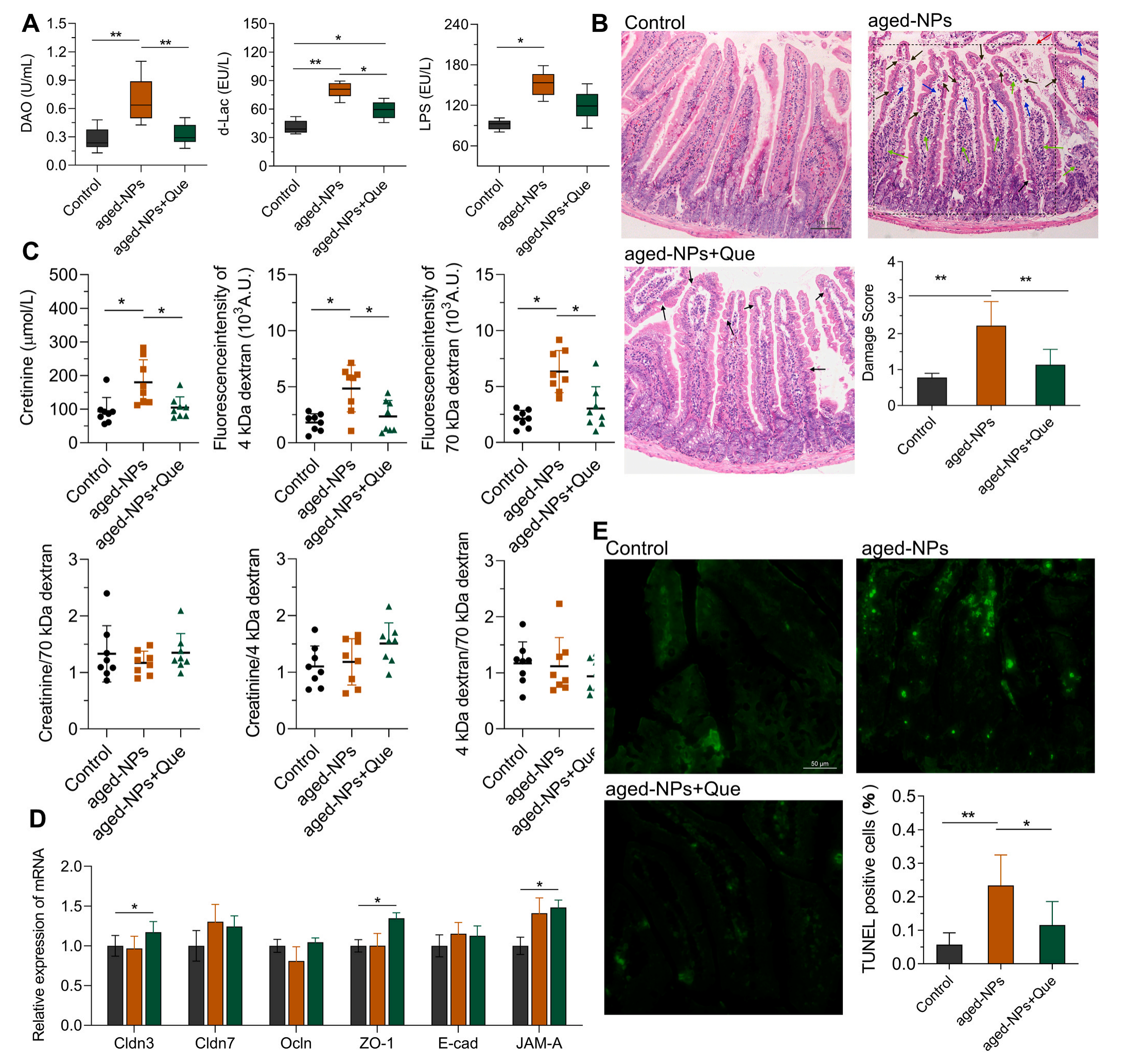 槲皮素 (Que) 占膳食總黃酮類化合物的 60-75%,是一種天然化合物,存在于人類飲食中的各種食物中,包括蔬菜、水果和茶,Que 及其衍生物可以調(diào)節(jié)多個細(xì)胞內(nèi)靶標(biāo)和細(xì)胞信號傳導(dǎo)過程的能力,具有抗氧化和抗炎分子的作用,探索膳食補充劑 Que 是否可以改善 NPs 誘導(dǎo)的腸道屏障功能障礙具有重要意義。本研究通過轉(zhuǎn)錄組學(xué)、組織病理學(xué)和免疫學(xué)分析探討老化 NPs 暴露下腸道屏障損傷的機制,此外,還評估了 Que 在老化 NPs 暴露下對腸道屏障的積極影響。