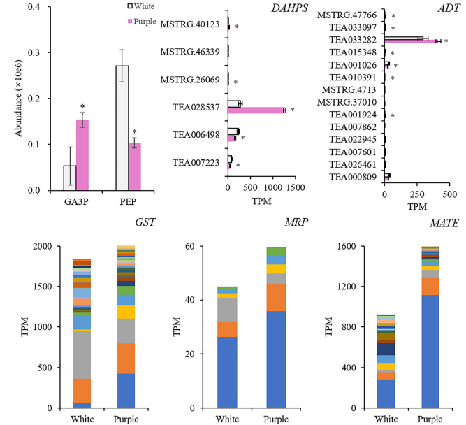 選擇與AP和DpG高度相關(guān)的轉(zhuǎn)錄因子(TFs),研究它們與差異表達(dá)的結(jié)構(gòu)基因的相關(guān)性。結(jié)果顯示MYB、AP2/ERF、bZIP、TCP、GATA等基因顯著表達(dá),并專注于Phe上游合成基因的調(diào)控(DAHPS;和AP(苯乙醛還原酶、短鏈脫氫酶/還原酶)、Dp(F3’H;F3’?5’?H)和DpG(BZ1)的合成,但抑制黃酮(黃酮醇合酶)和兒茶素(白花青素還原酶)的形成。這些結(jié)果發(fā)現(xiàn)了紫茶樹中揮發(fā)性BPs的促進(jìn)作用,擴(kuò)展了我們對BPs型顏色與香氣關(guān)系的理解。